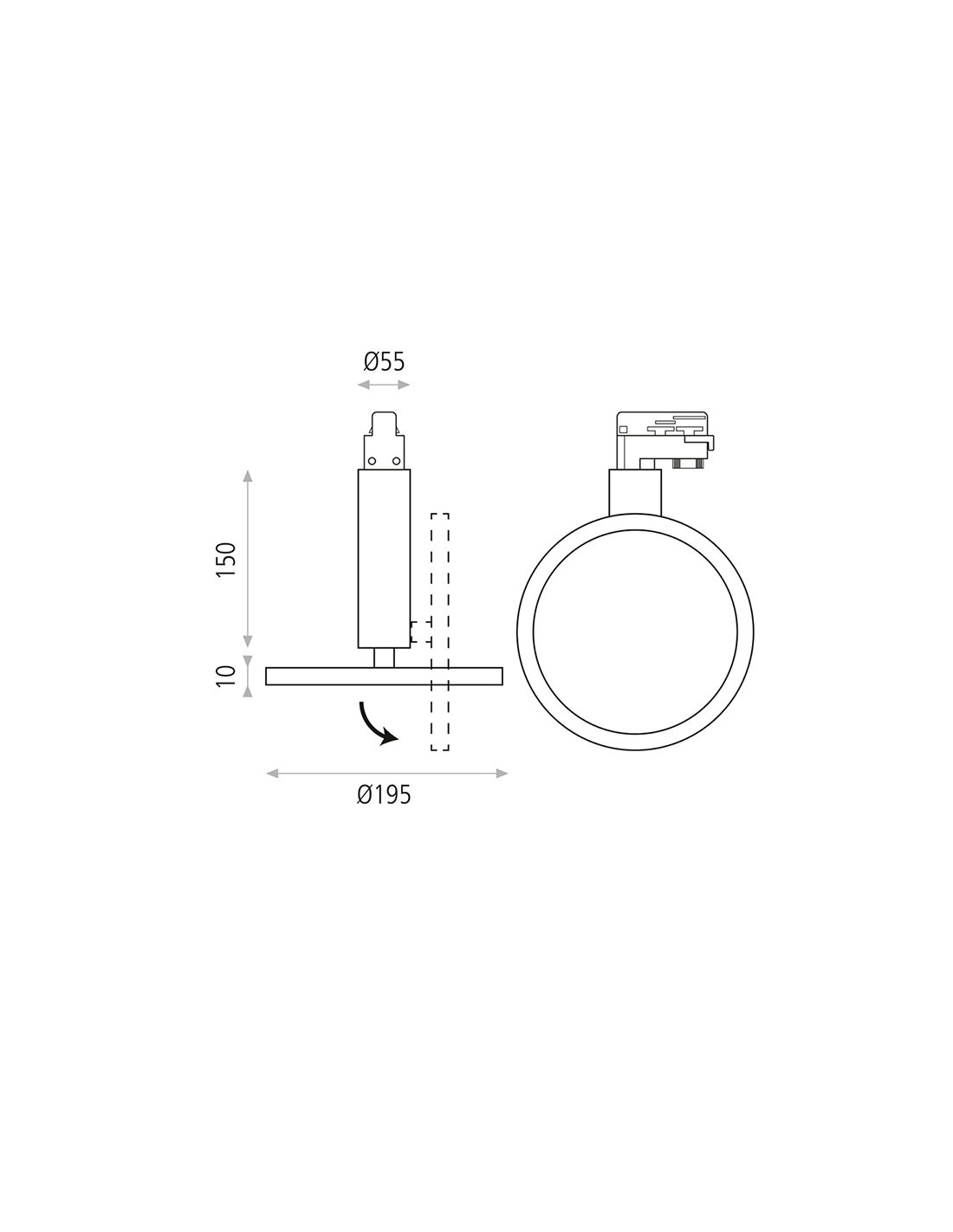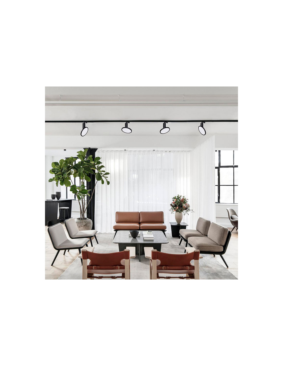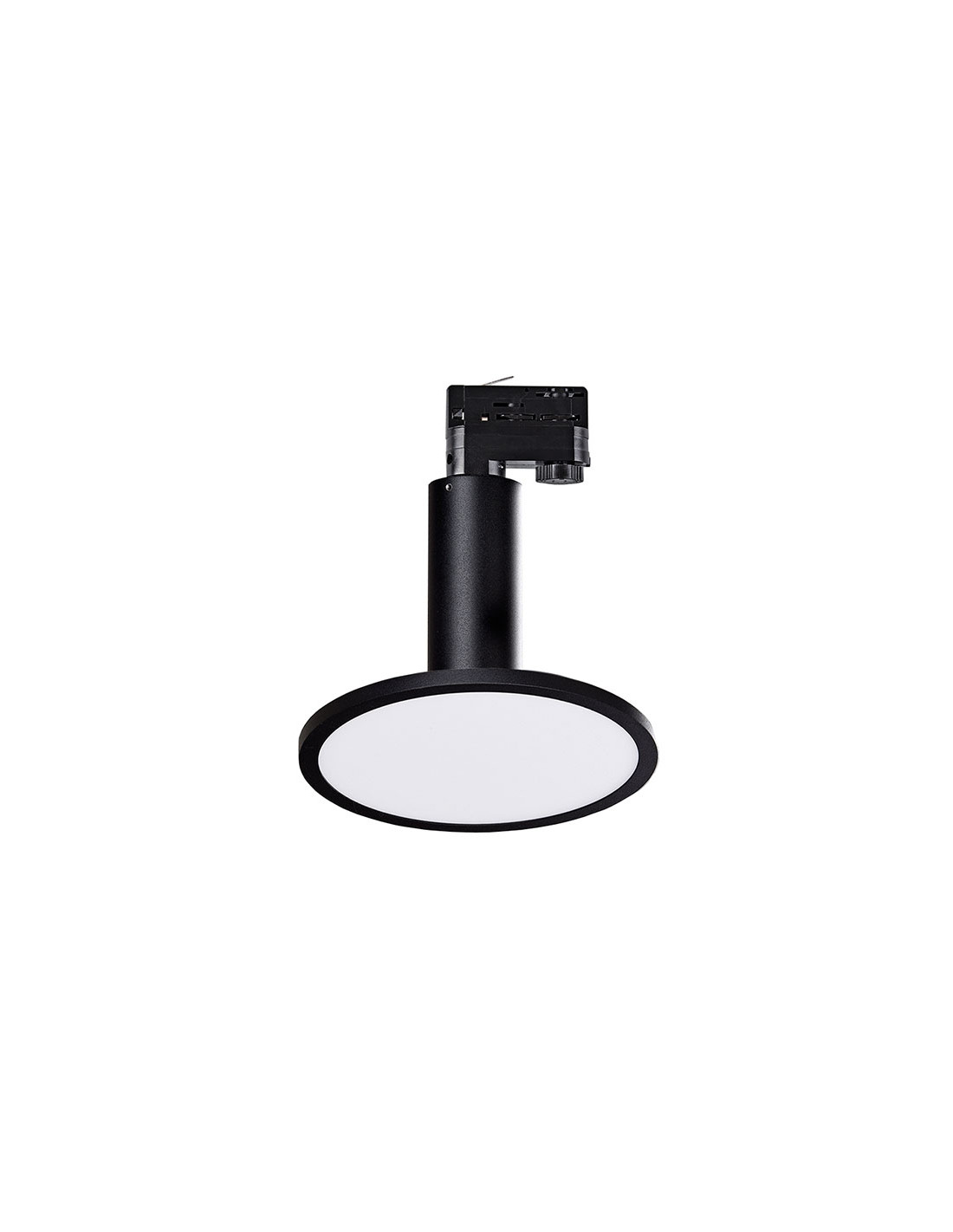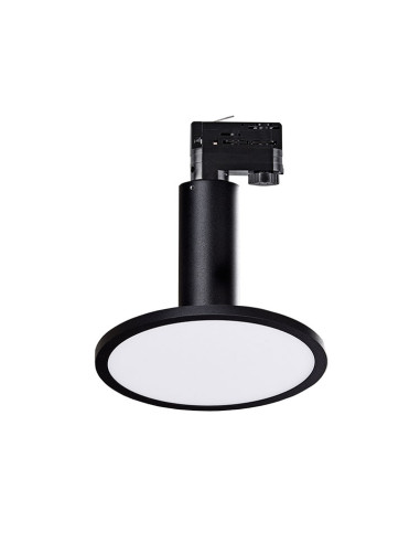 Foco para carril trifásico con forma de panel circular orientable, realizado en metal negro texturado, de potencia lumínica de 18W en blanco cálido.