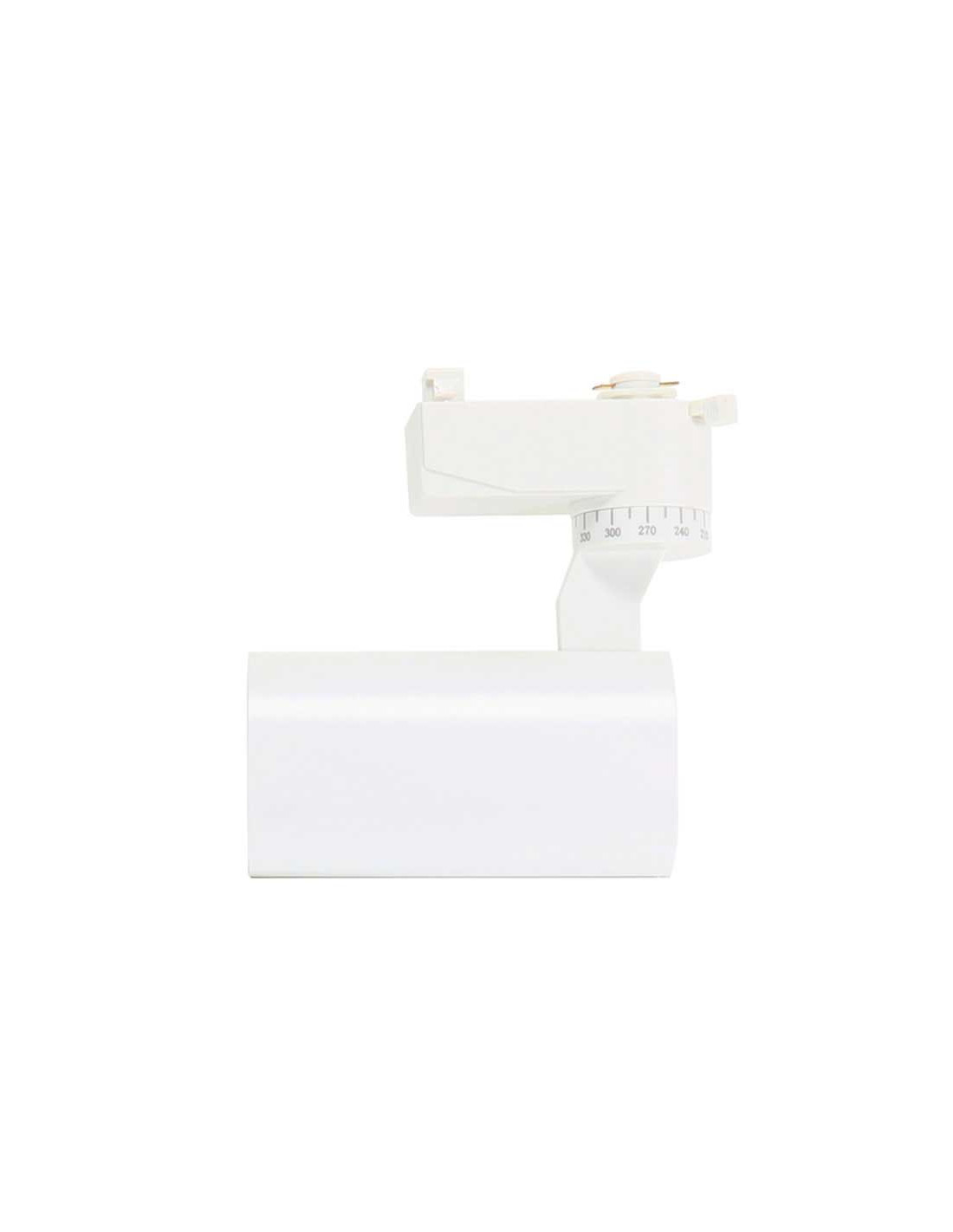 Foco de carril con 12W de potencia en blanco cálido, construído en aluminio. Perfecto para exhibir todo tipo de productos o reforzar espacios tales como librerías, cuadros, esculturas, etc. Dimensiones 140X135mm.