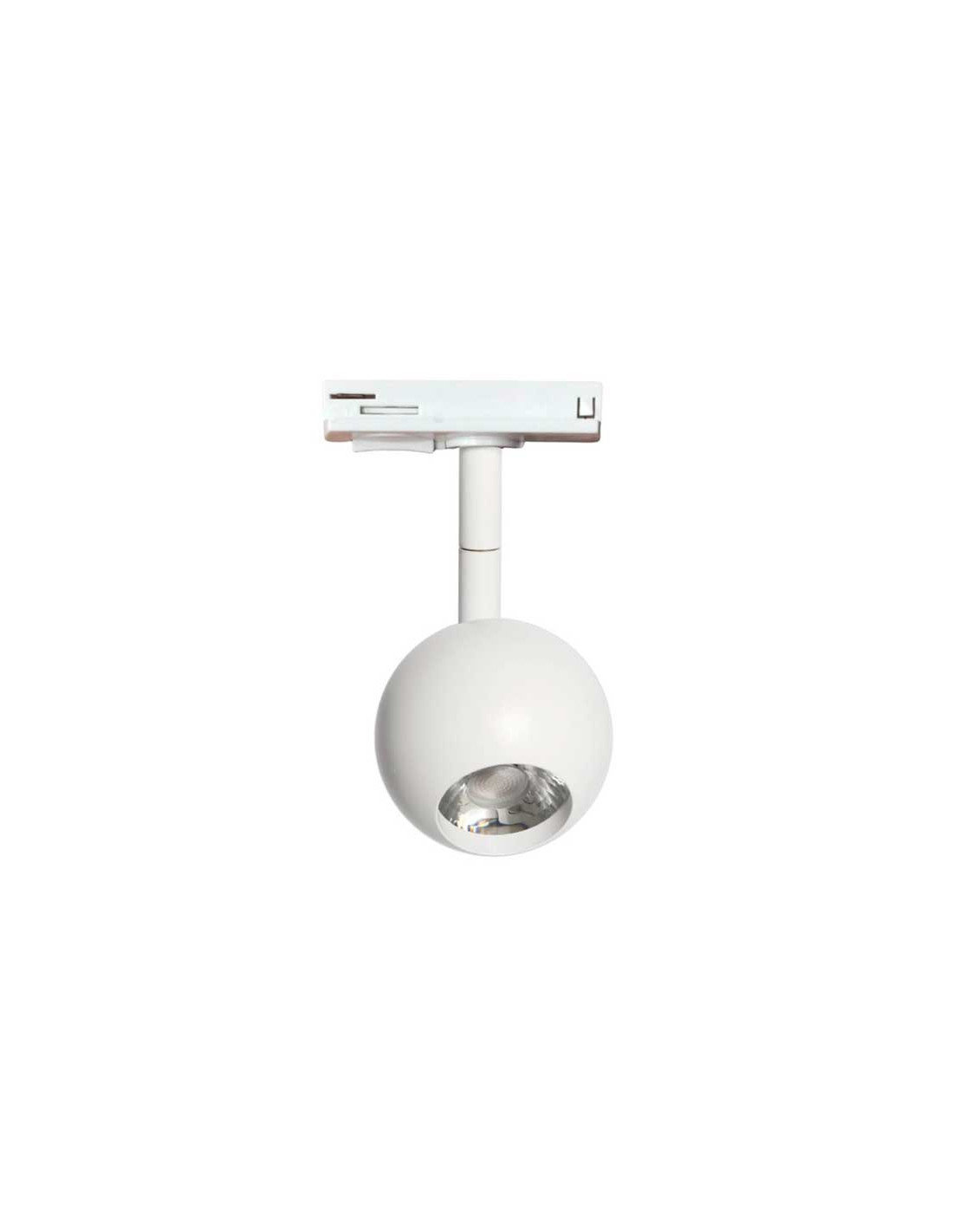 Foco Mini esfera orientable de carril monofásico color blanco con LED Bridgelux de 10W y 1000 lm en 3000K. Cuenta con un Índice de Resplandor UGR13 y un Índice de Relación cromática >CRI 93.