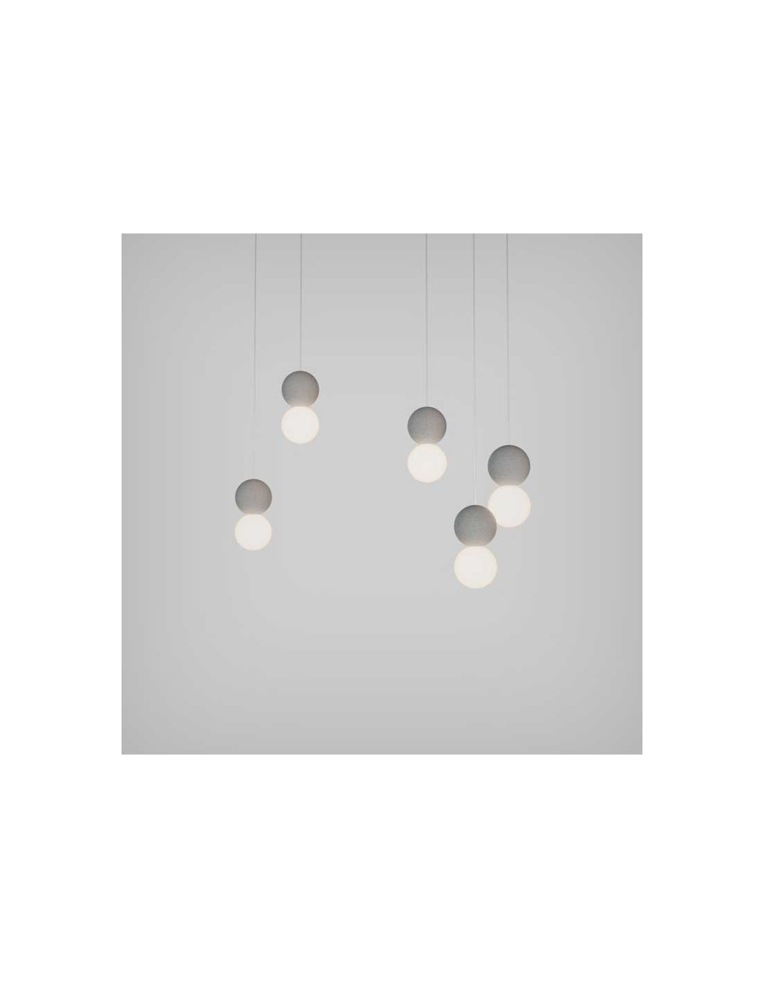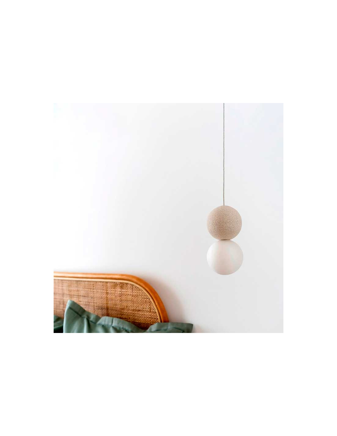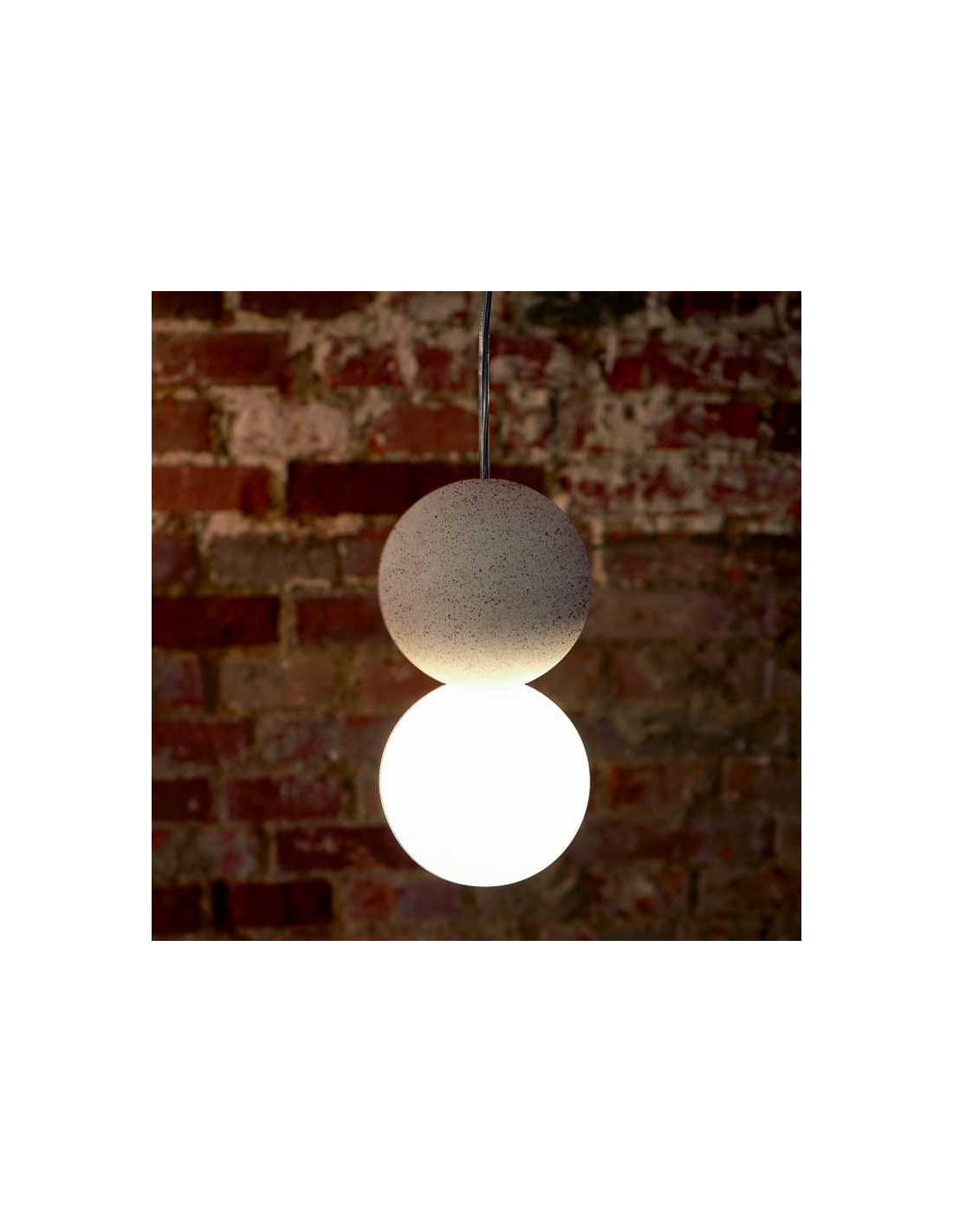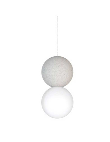 Lámpara de techo con una bola de cemento y otra de cristal opal. El cable está recubierto con tela de nylon blanca. Funciona con bombilla G9 (no incluida) Diámetro 10cm.
