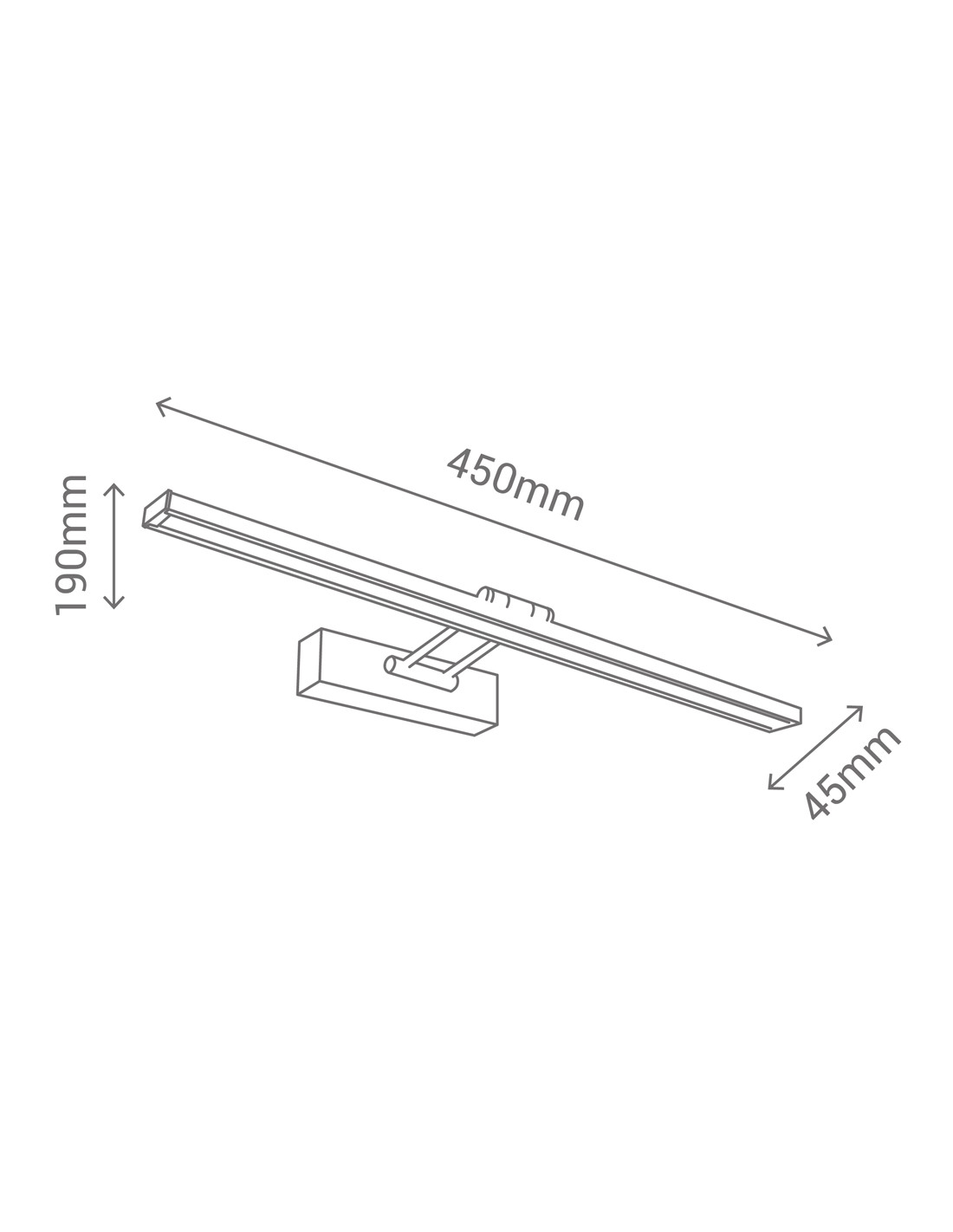 Aplique para baño sobre espejo, o para iluminar cuadros con 12W de potencia. Su elegante diseño permite una iluminación potente sin reflejos molestos. IP44- 4000ºK - 12W