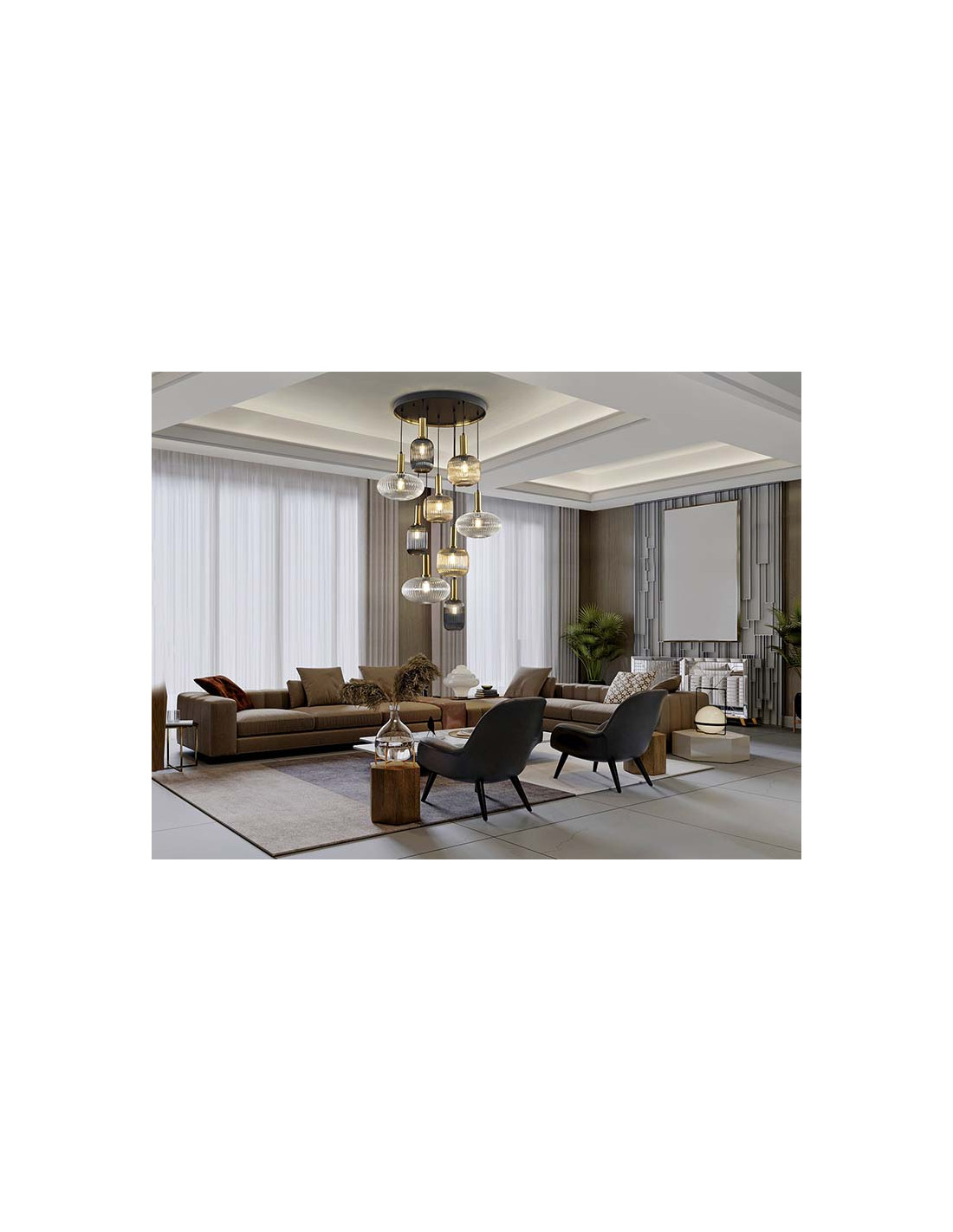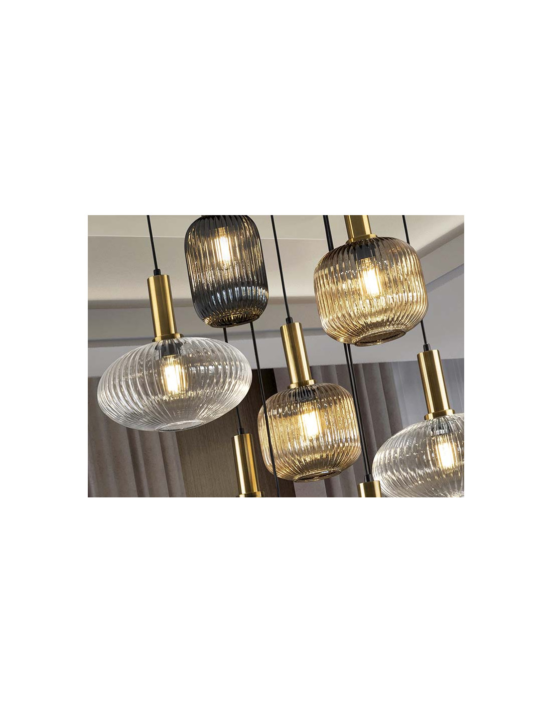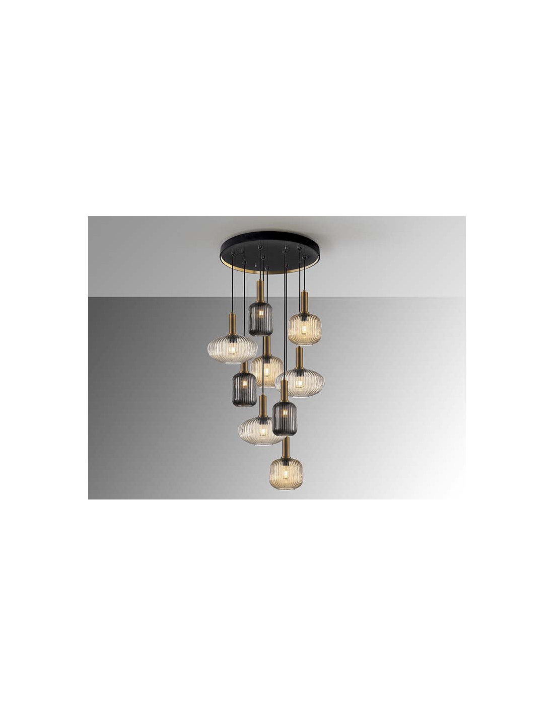 Lámpara de 9 luces realizada en metal acabado negro mate, con detalles de latón satinado. Tulipas de cristal moldeado en acabados transparente , ambar y gris smoke espejado. Regulable en altura. 9x20W