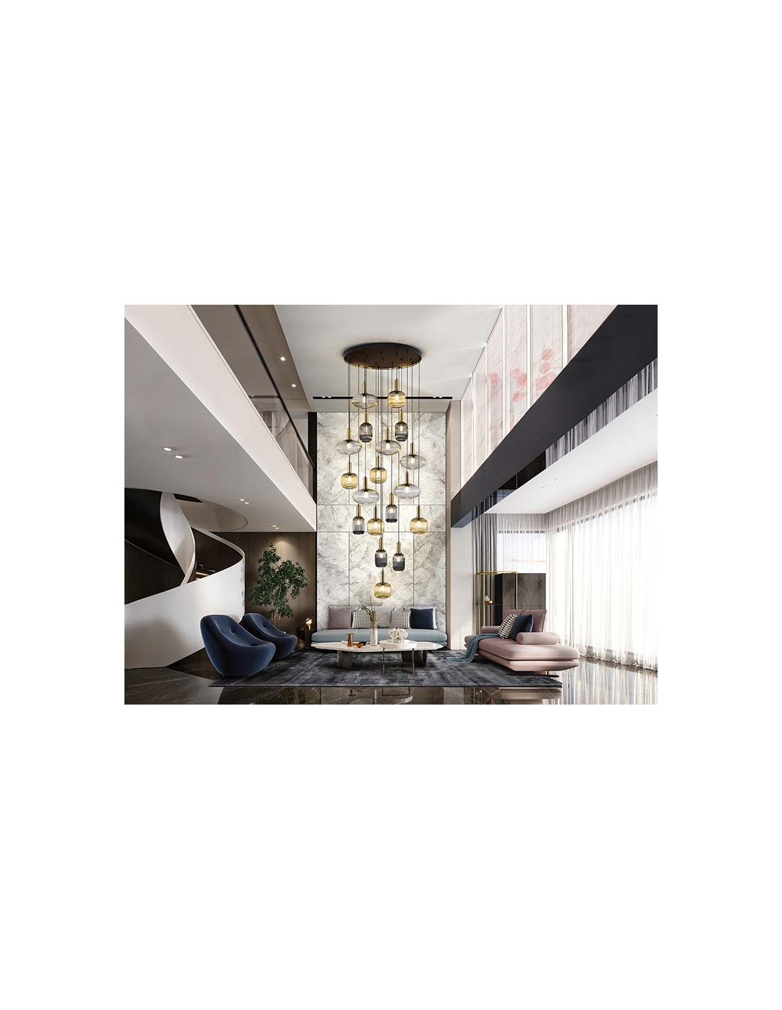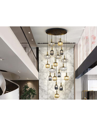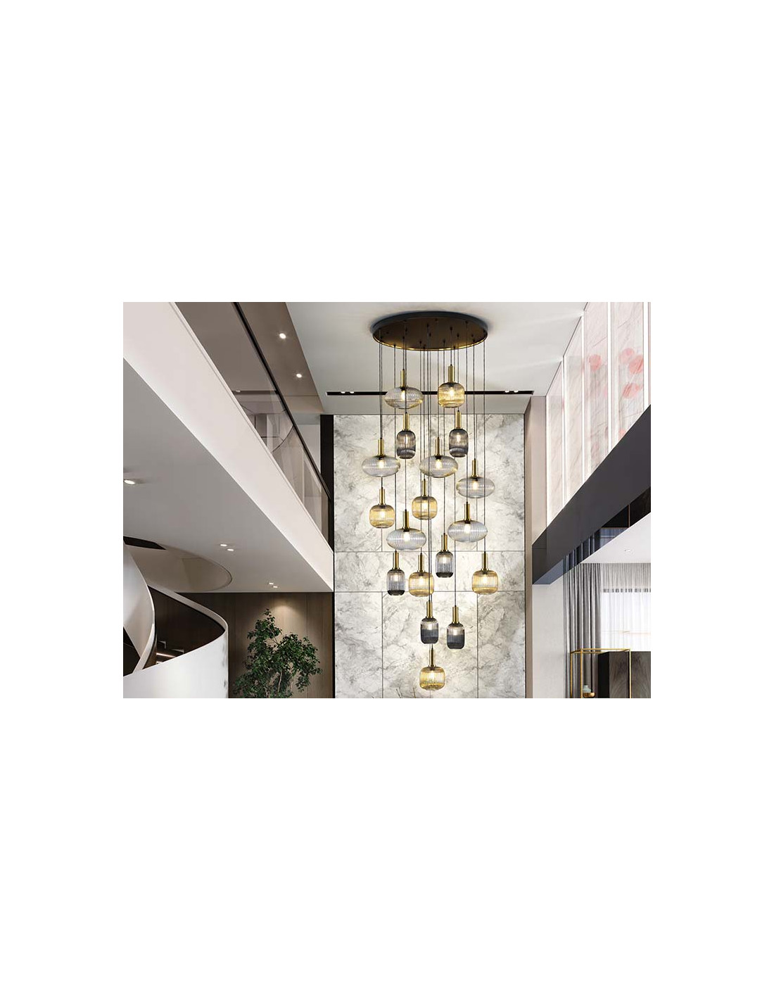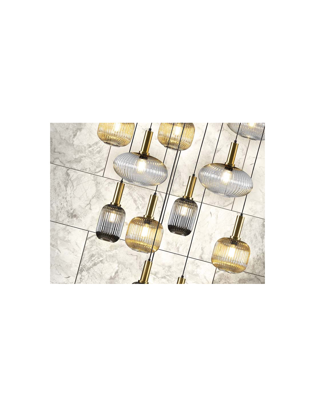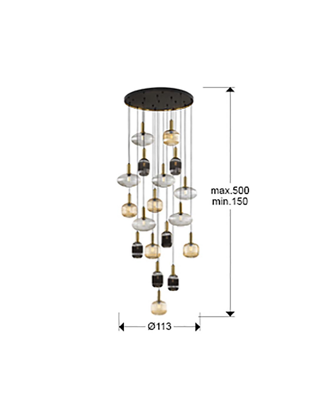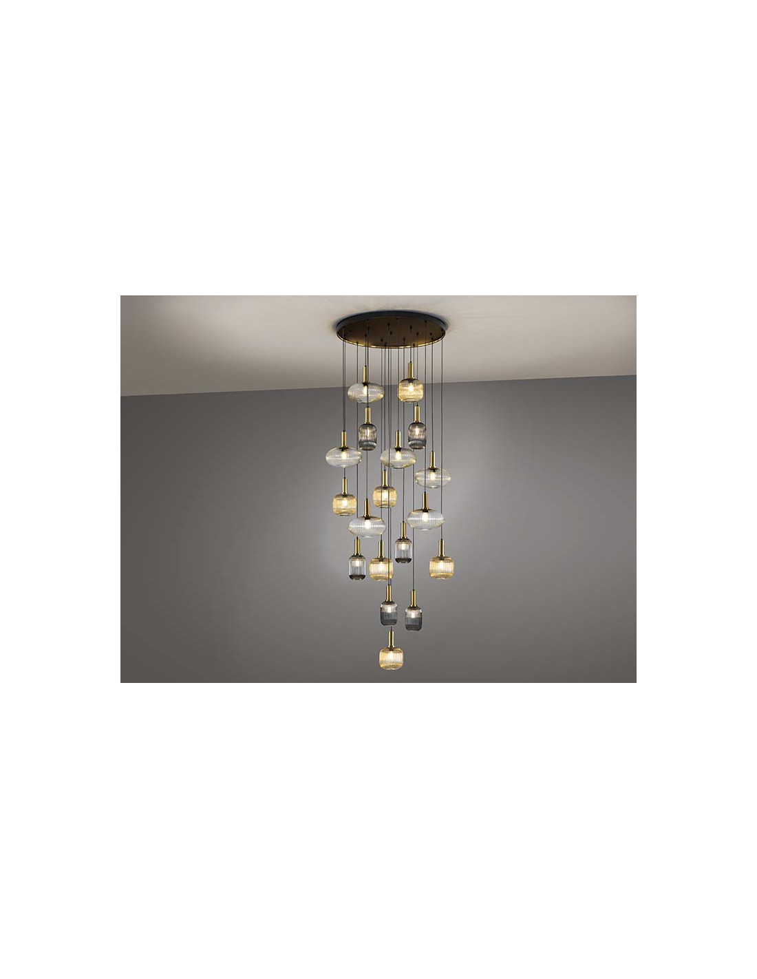 Lámpara de 18 luces realizada en metal acabado negro mate, con detalles de latón satinado. Tulipas de cristal moldeado en acabados transparente, ambar y gris smoke espejado. Regulable en altura. 18x20W