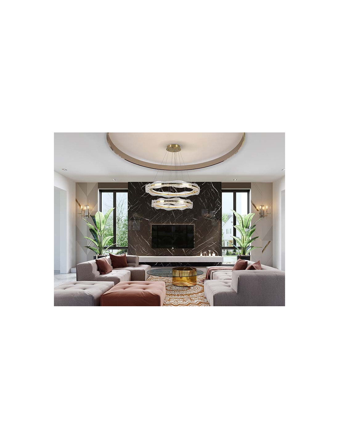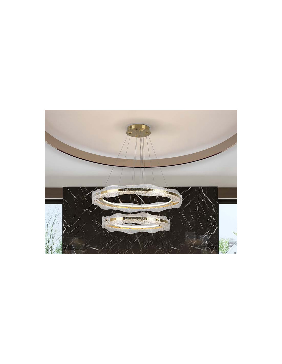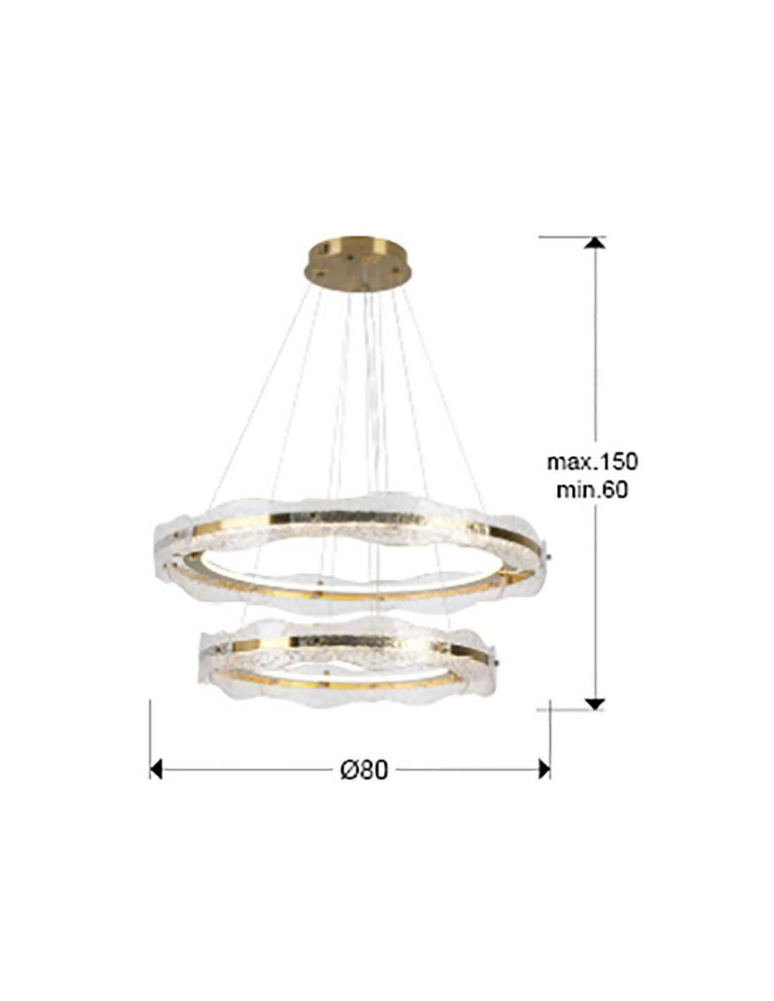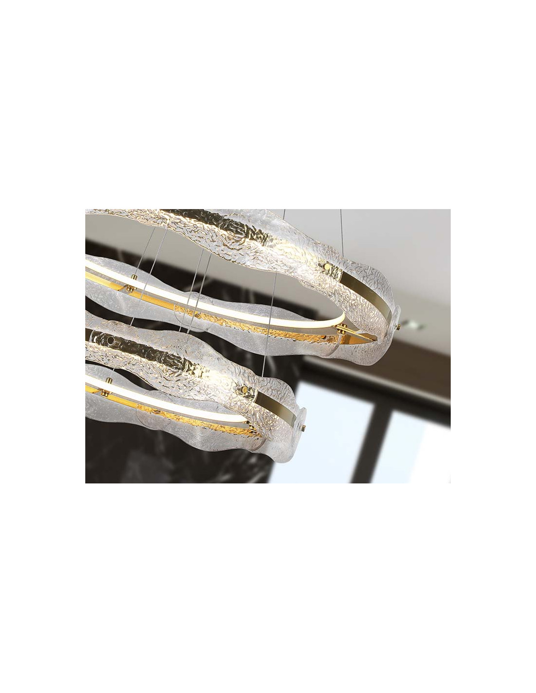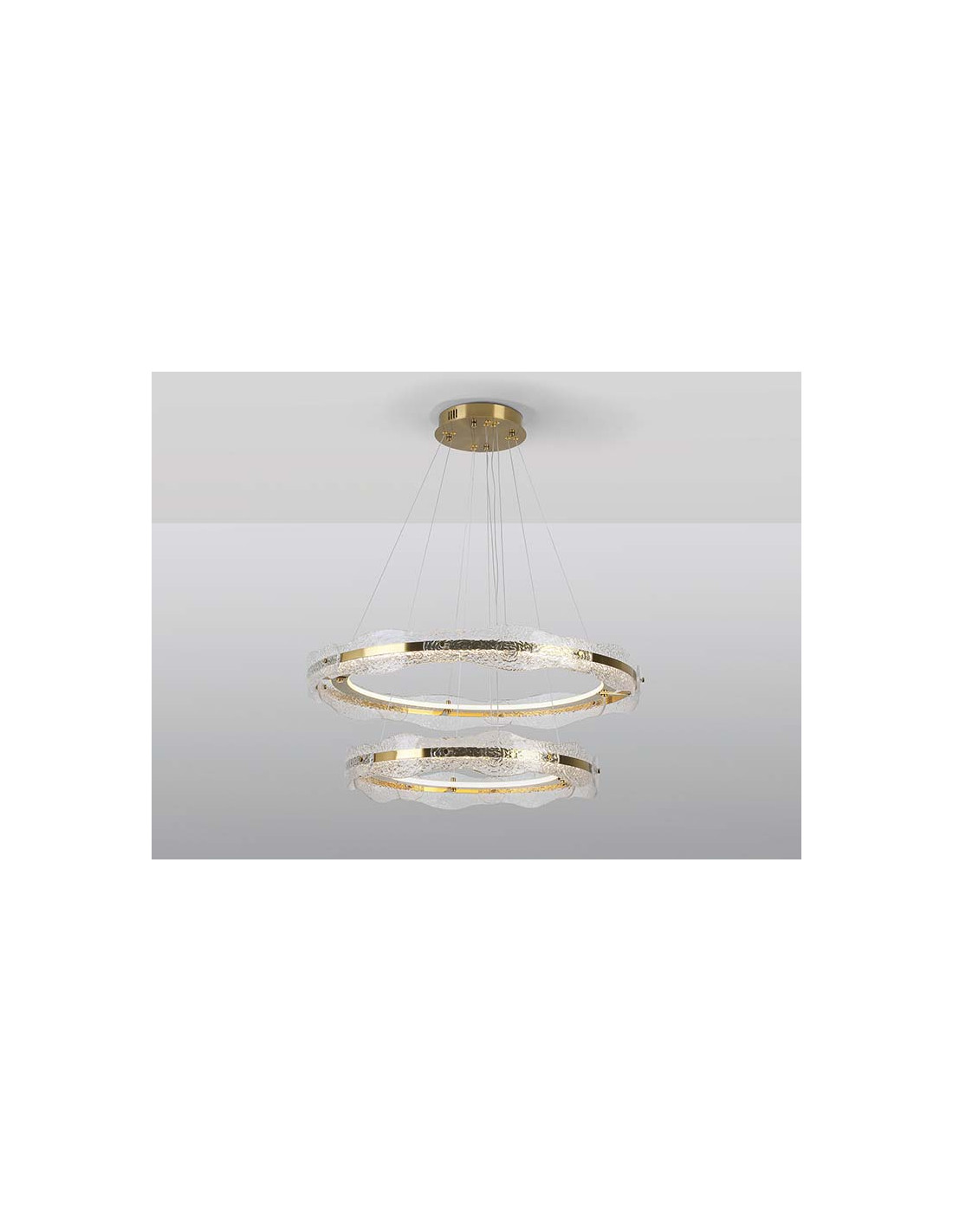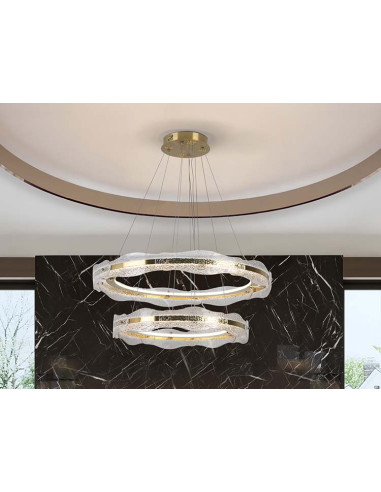 Lámpara de dos aros, realizada en metal y aluminio, acabado oro cepillado. Difusor de placas de cristal texturizado. Regulable en altura. Iluminación LED 93W, 4100Lm, 3.000K. 93W