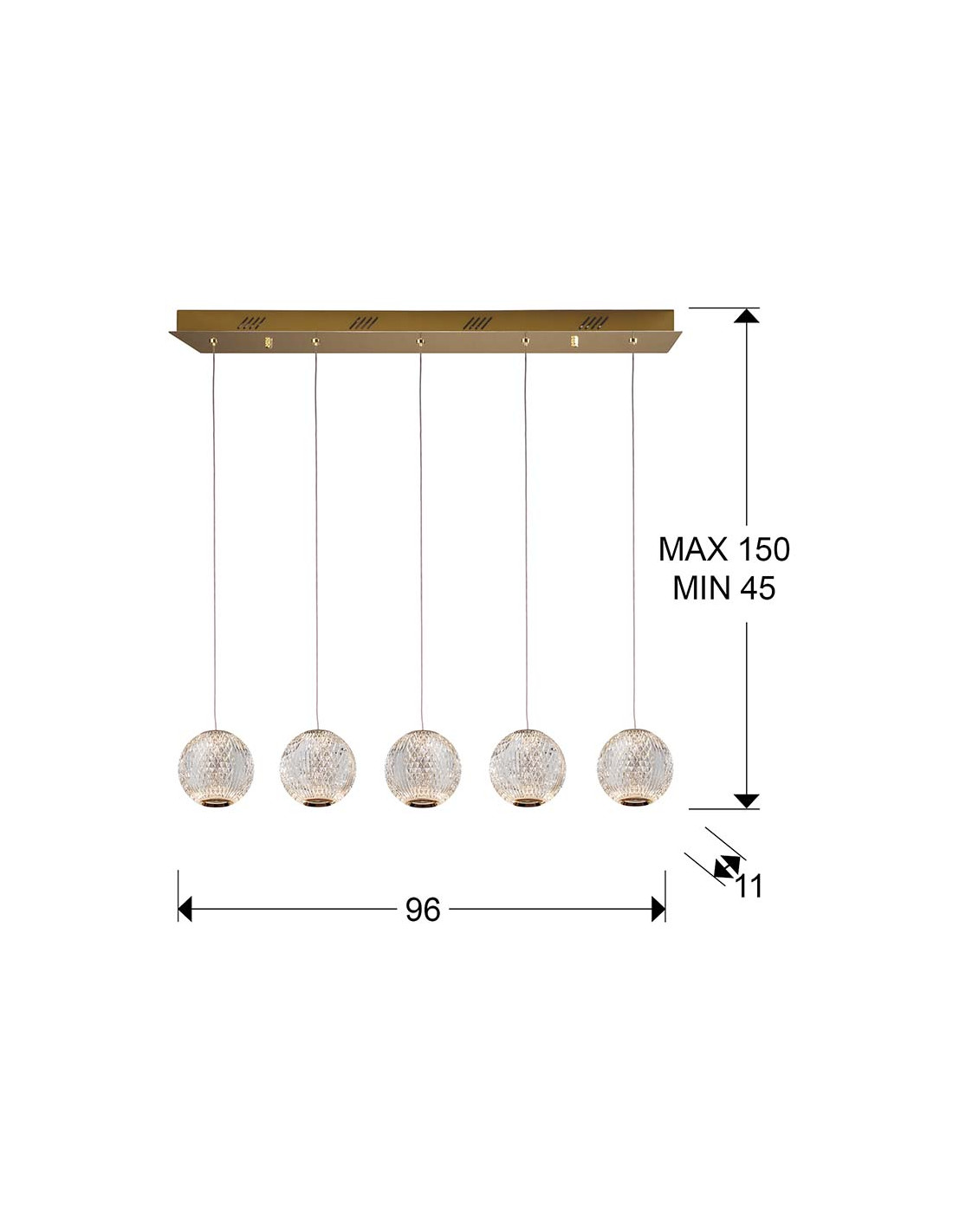 Lámpara de 5 luces LED, metal acabado oro. Tulipa esférica de Ø11cm de acrílico óptico transparente, símil cristal tallado. 26W LED. 3.200K, 1.264 lm. 26W