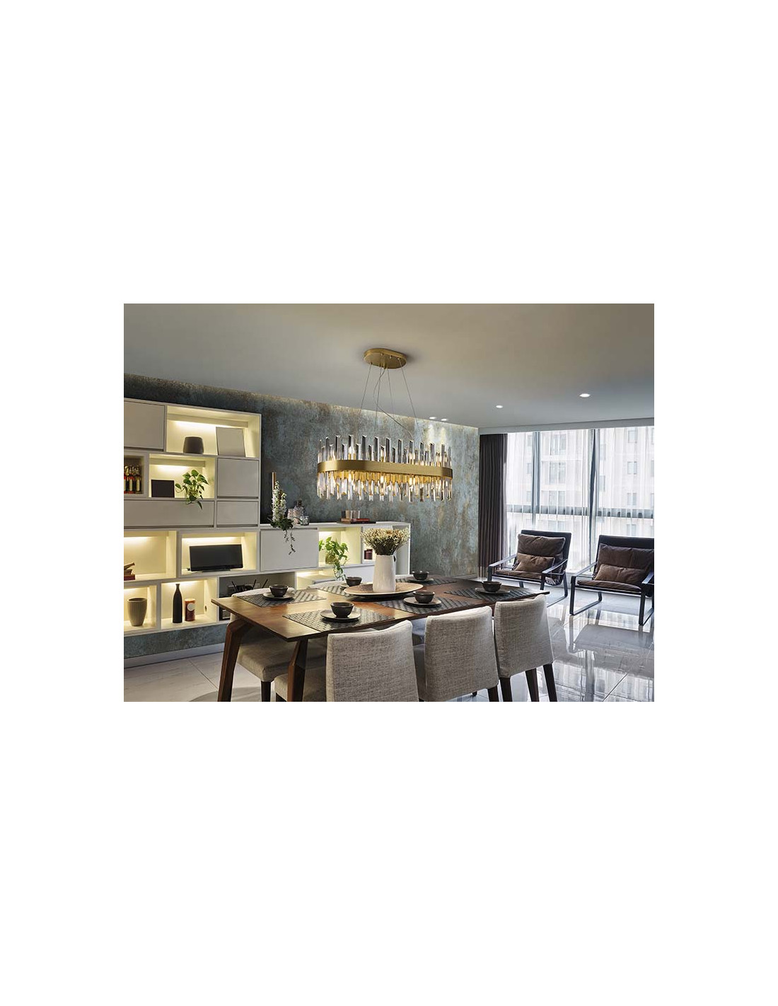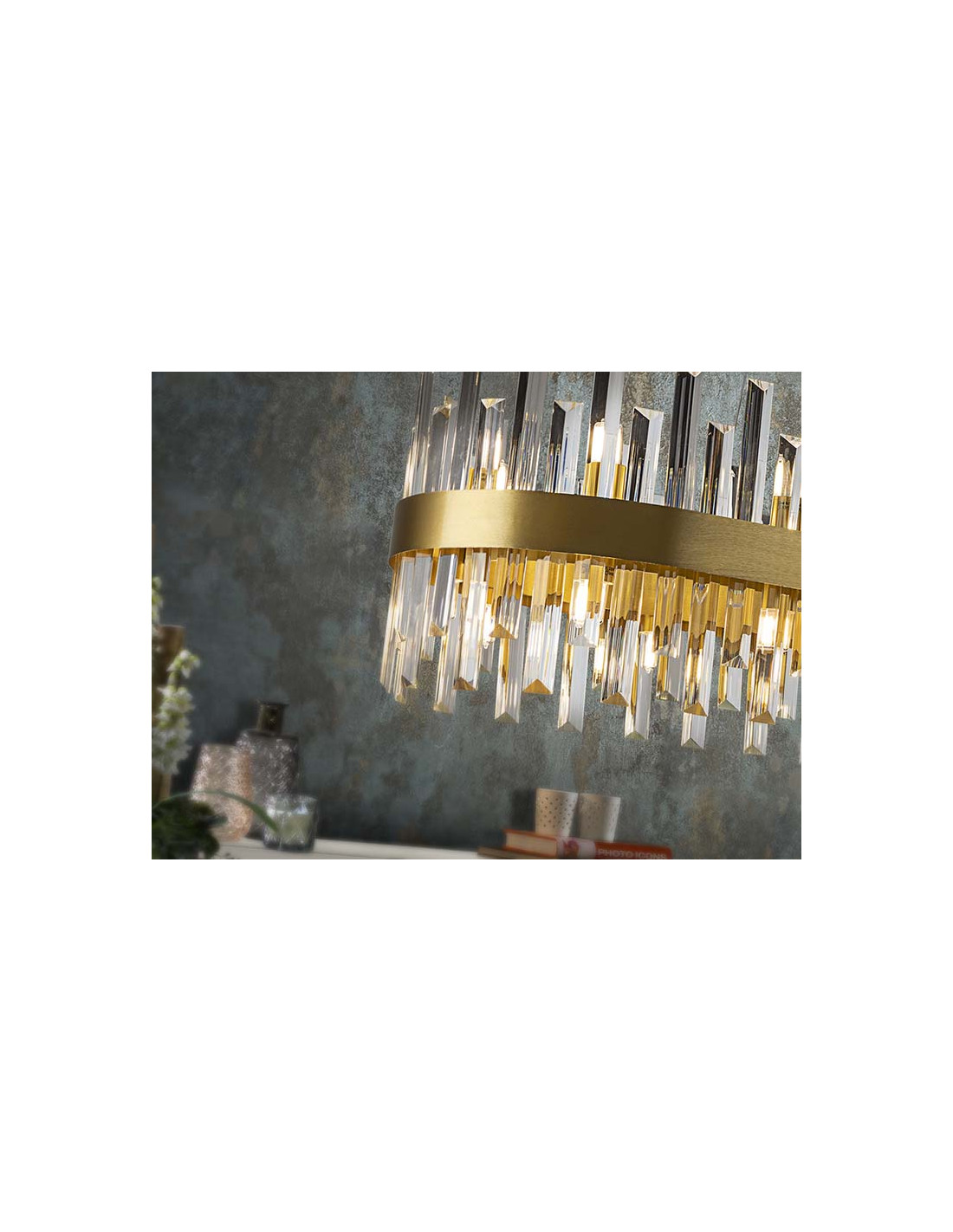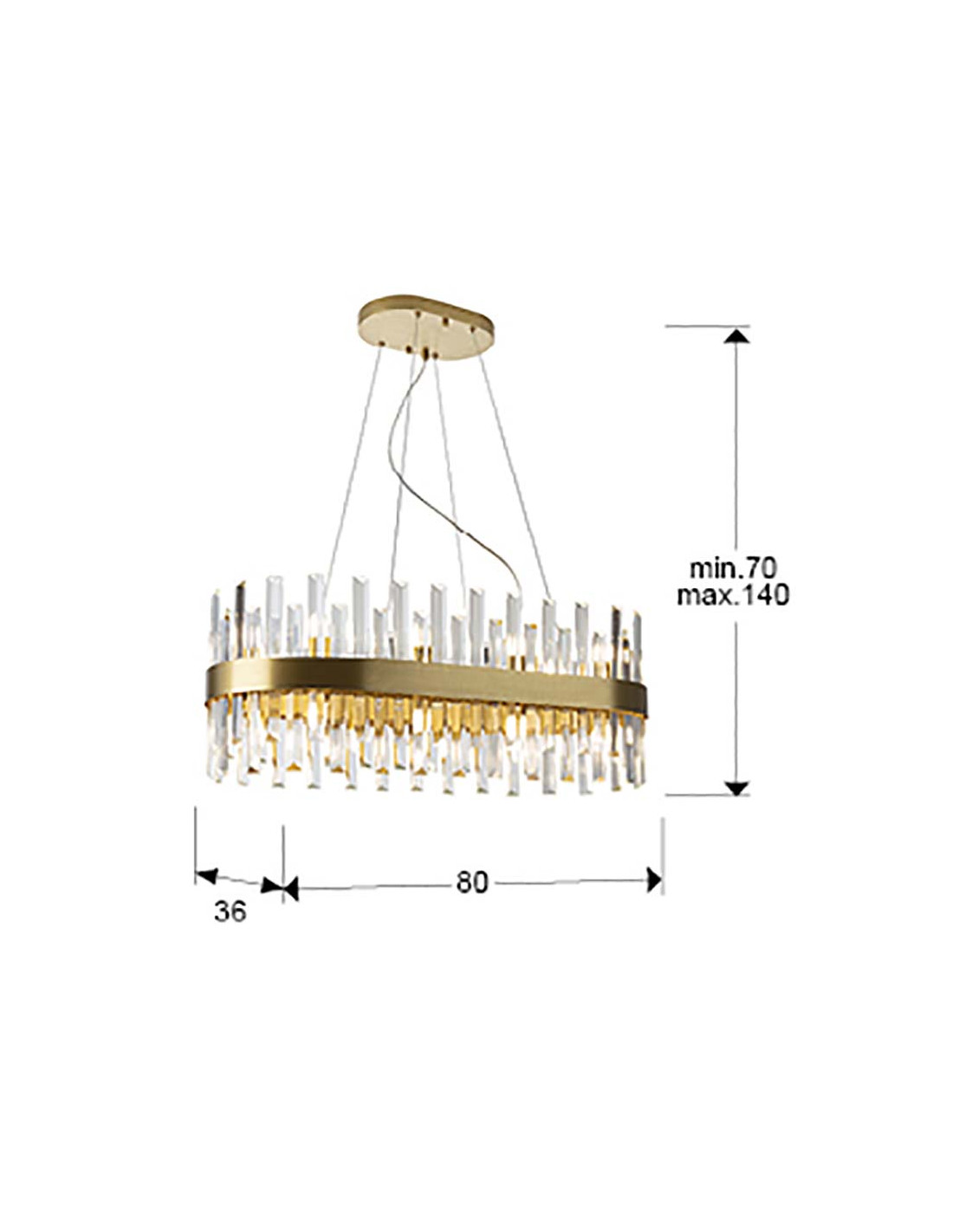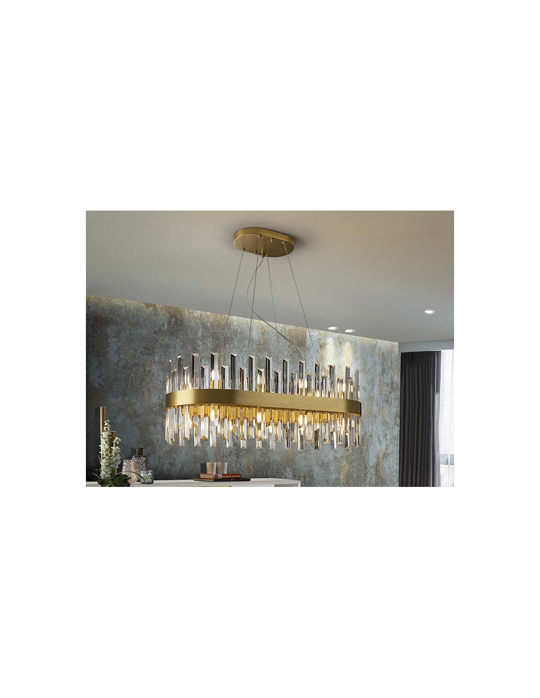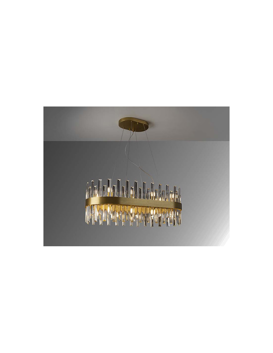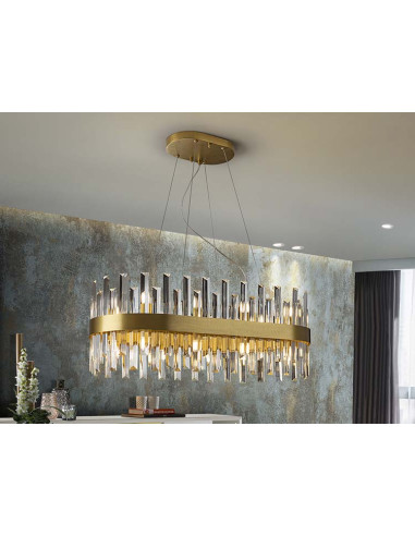 Lámpara ovalada de 20 luces, realizada en metal cepillado acabado oro. Difusor de barras de cristal transparente en forma de prisma. 20x28W