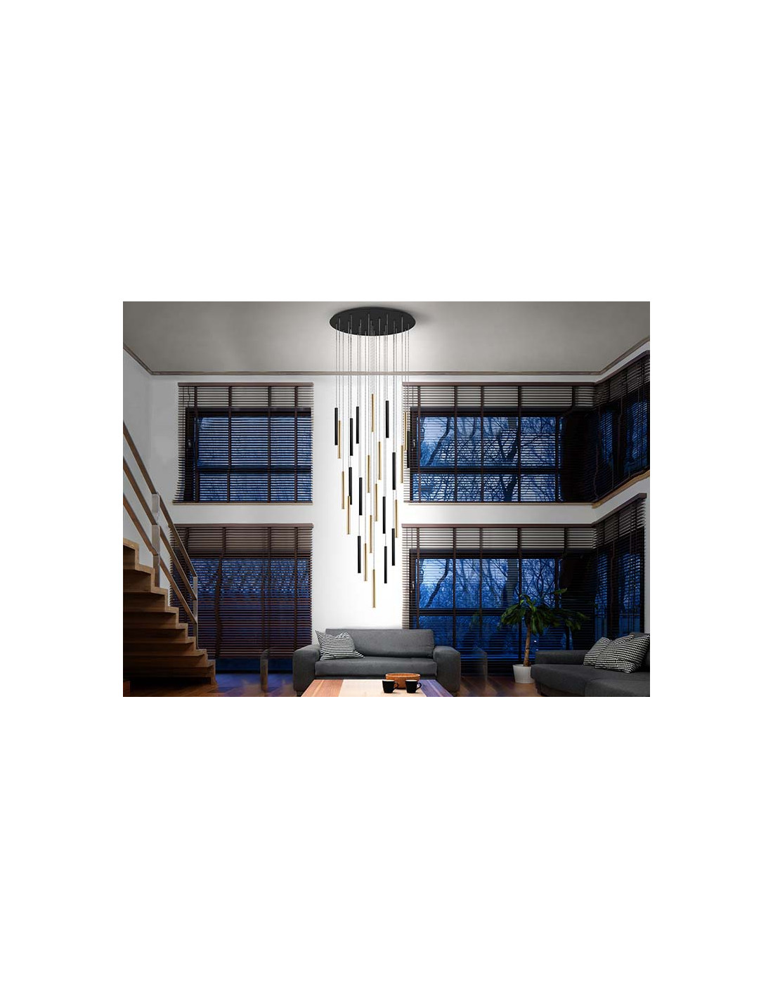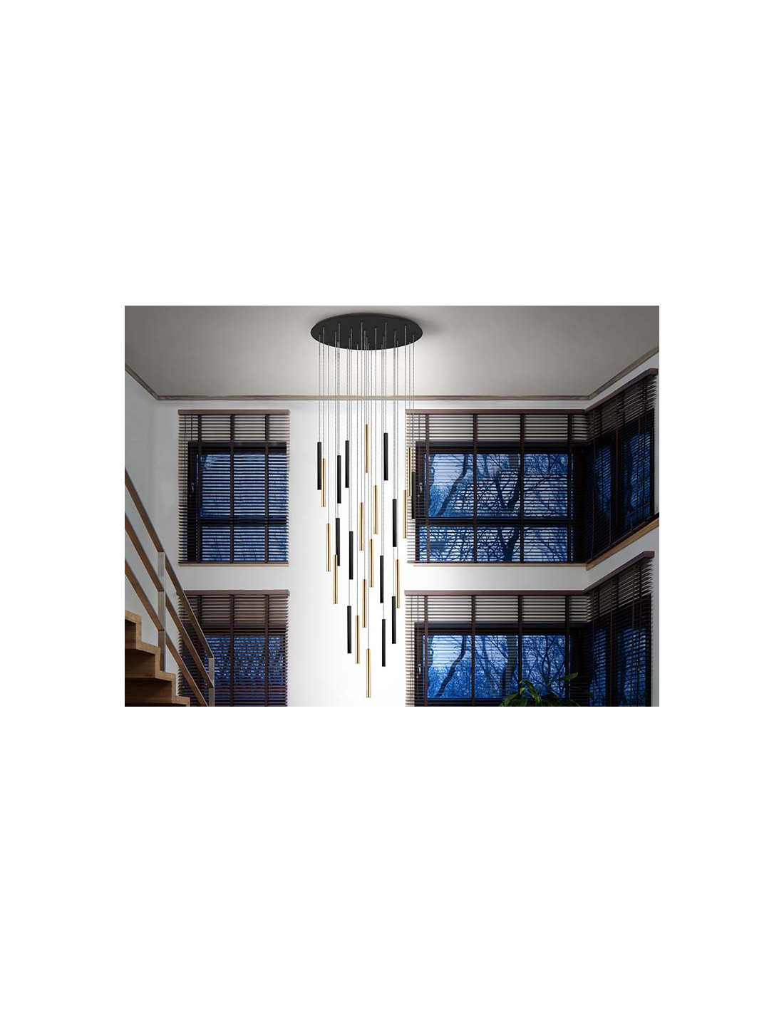 Lámpara redonda de 25 luces LED. Realizada en metal acabado oro y negro mate. Difusor acrílico opal. 125W LED, 11.250 lm, 3.000 K. Altura máxima 300cm. DIMABLE. Incluye mando a distancia. 125W