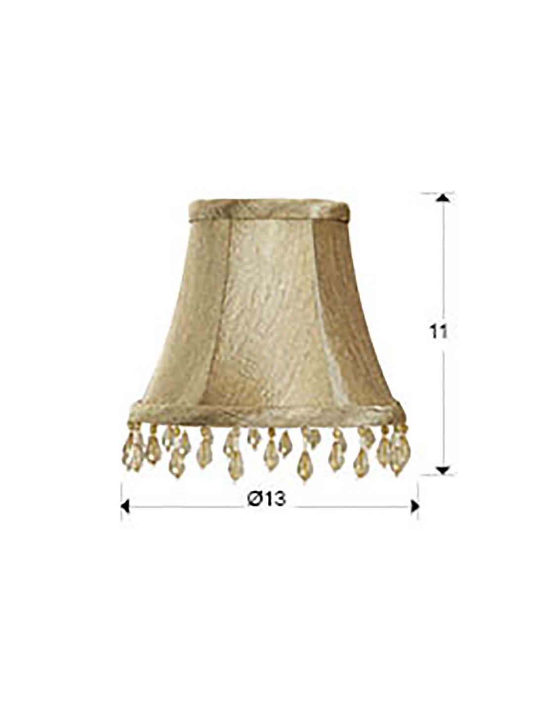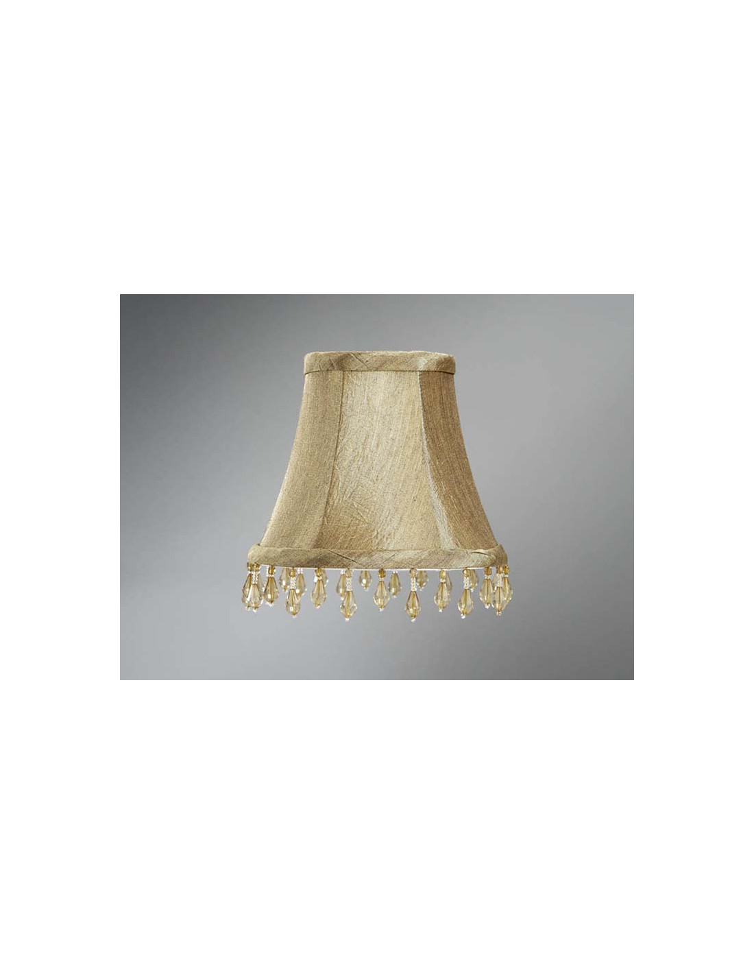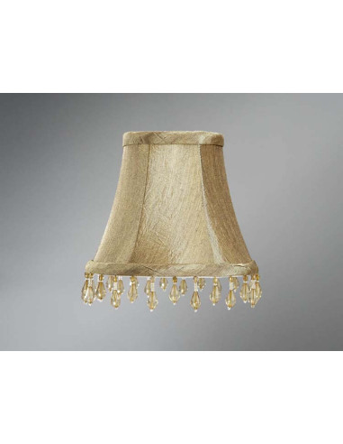 Pantalla con sistema pinza, realizada en tejido sedoso, con fleco de abalorios. Para E14.