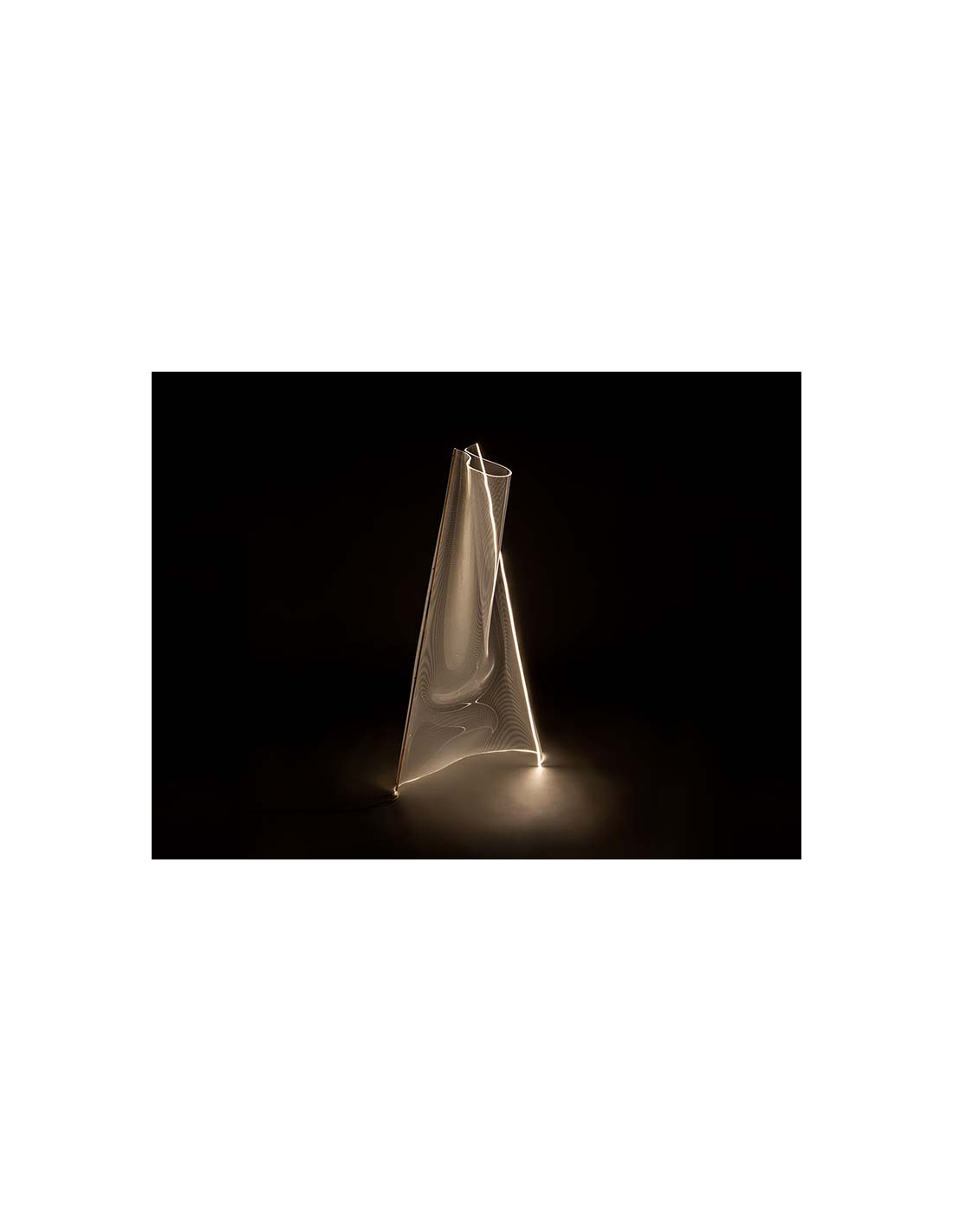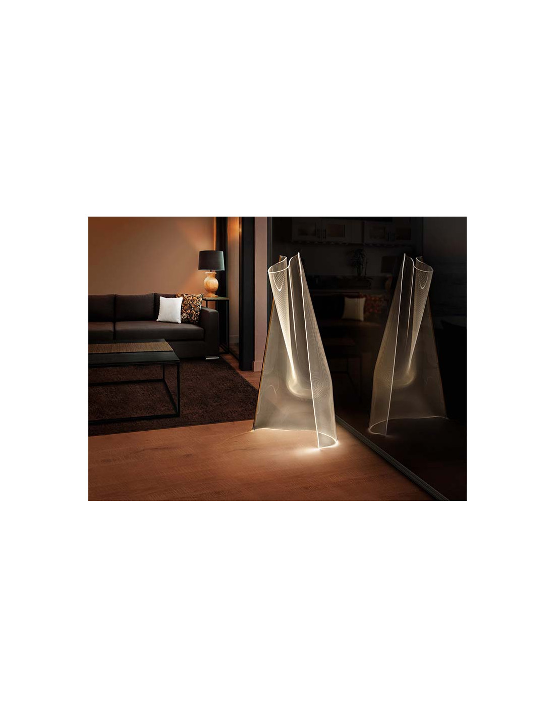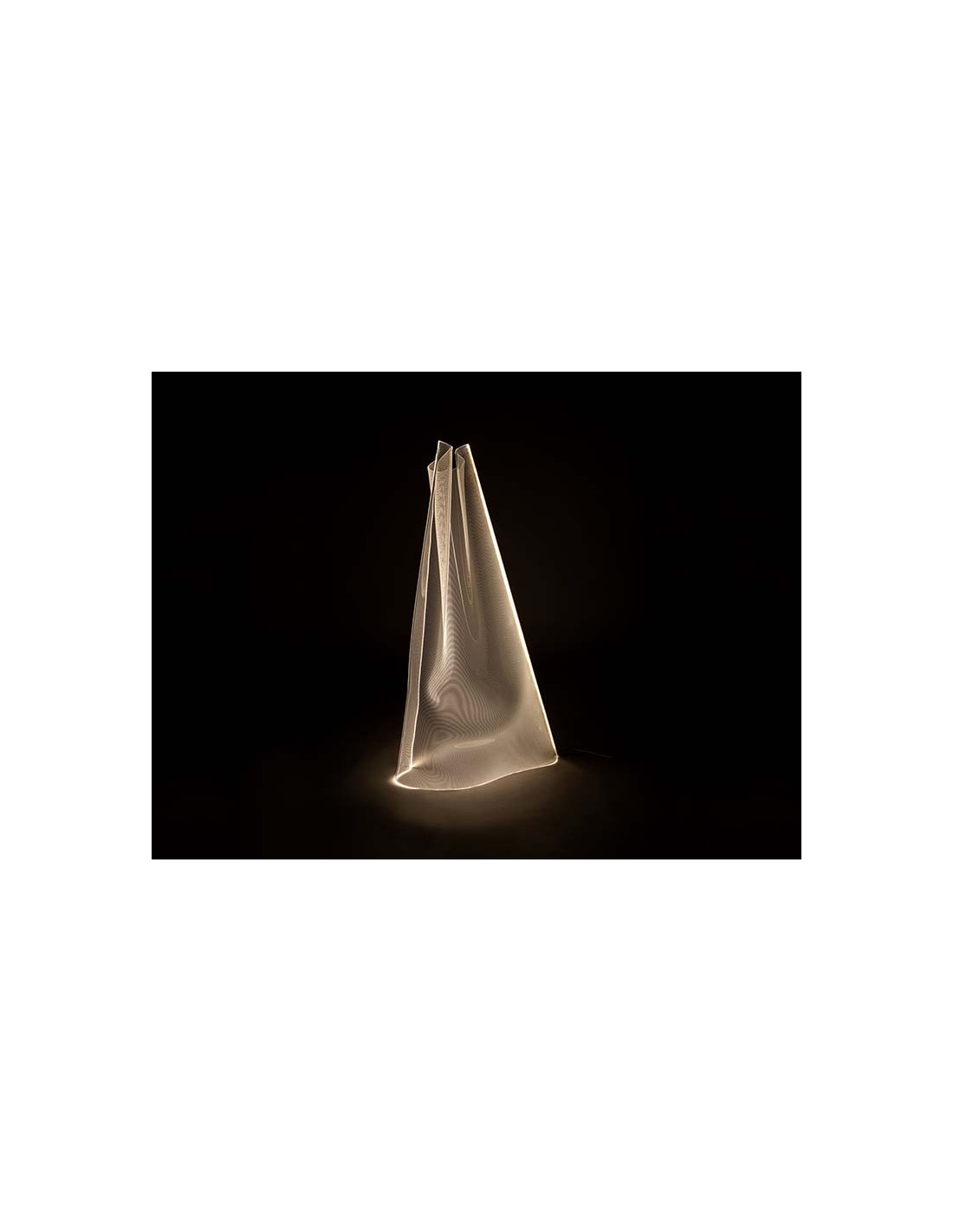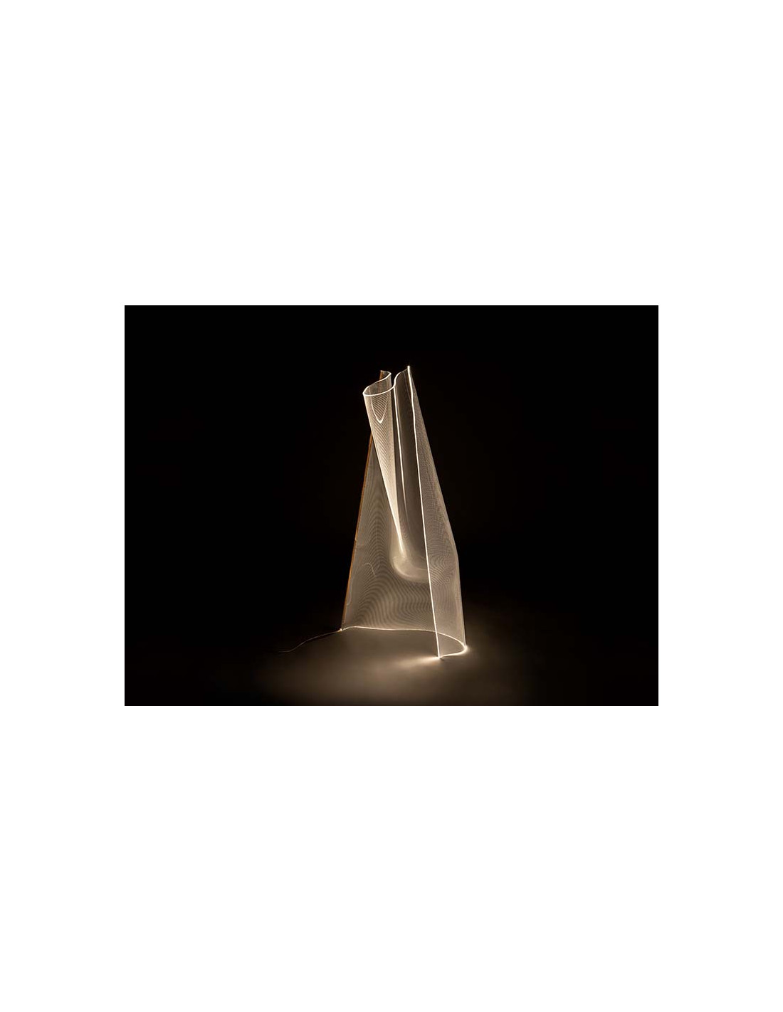 Lámpara de pie formada por una lámina de metacrilato microimpreso moldeado y perfíl metálico color oro rosa. Iluminación LED 17W 1.564lm 3.000K. 17W