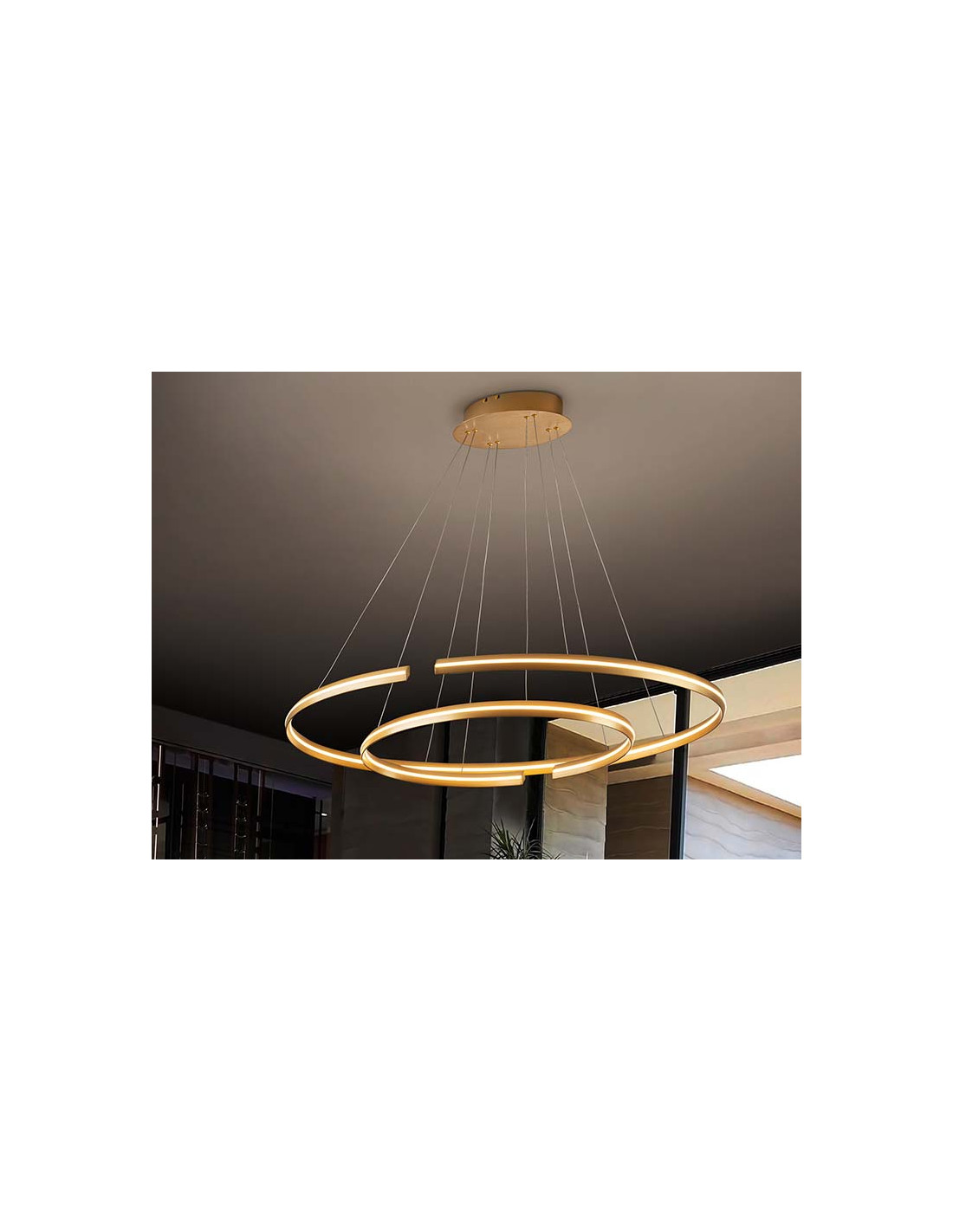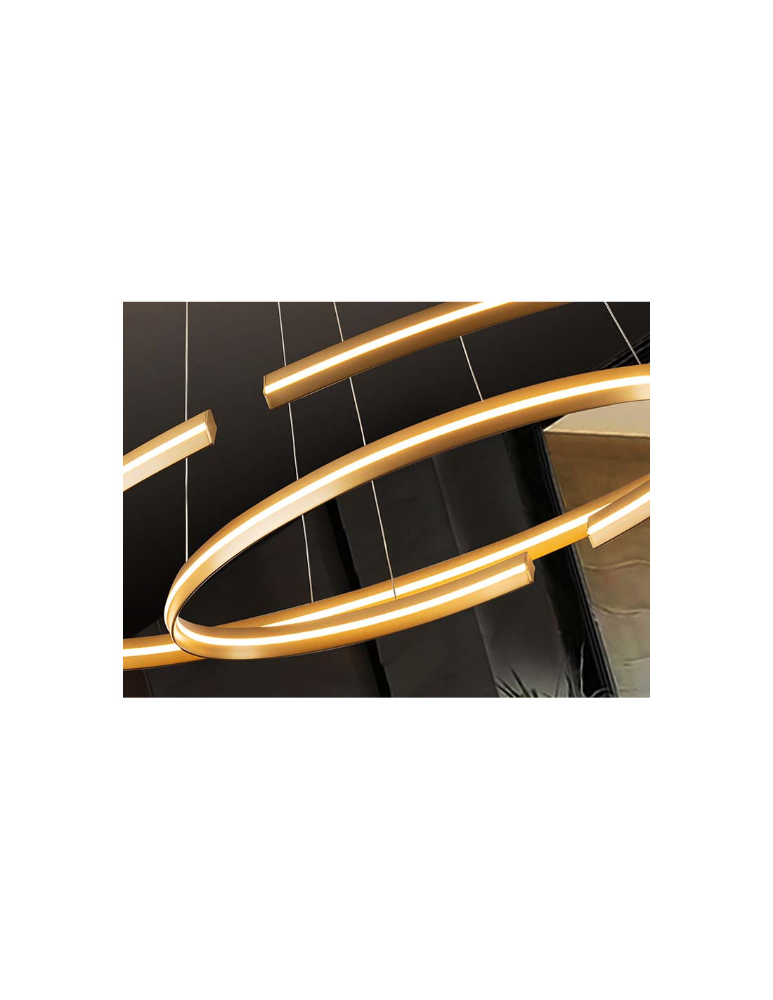 Lámpara de techo de luz LED, formada por dos elipses, realizada en metal y aluminio, acabado oro cepillado. Difusor acrílico opal. DIMABLE por BLUETOOTH con APP para smartphone.100W LED, 4.144 lm, 3.000 K. 100W