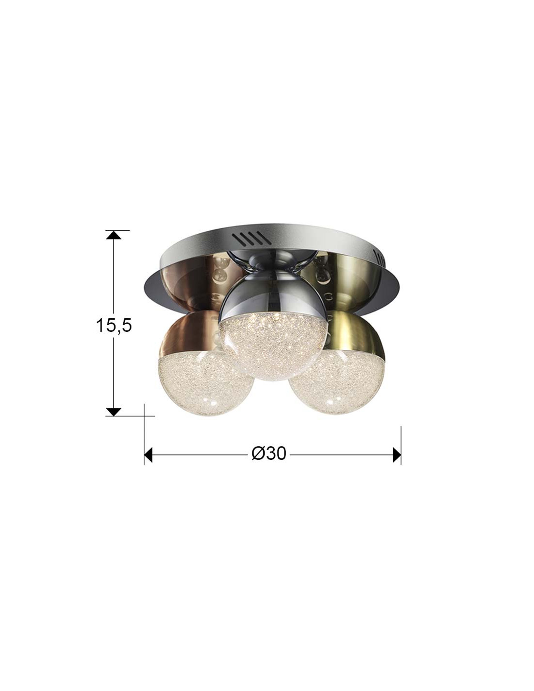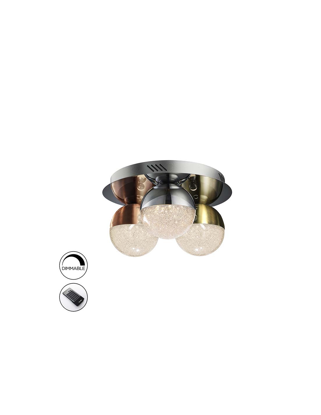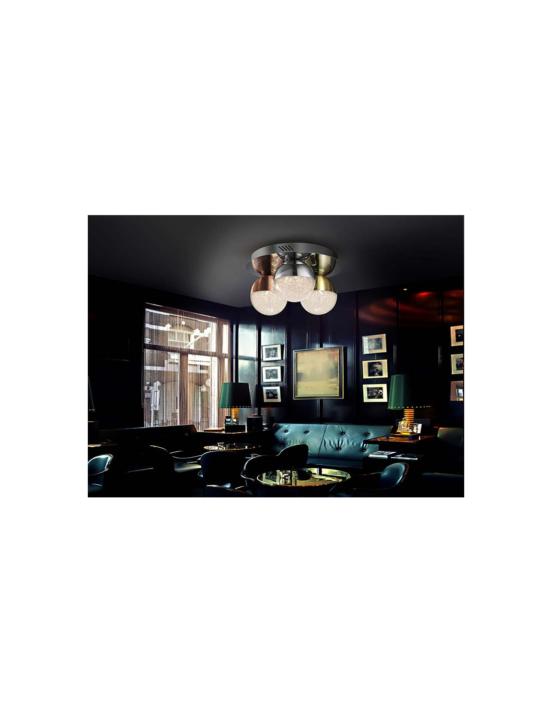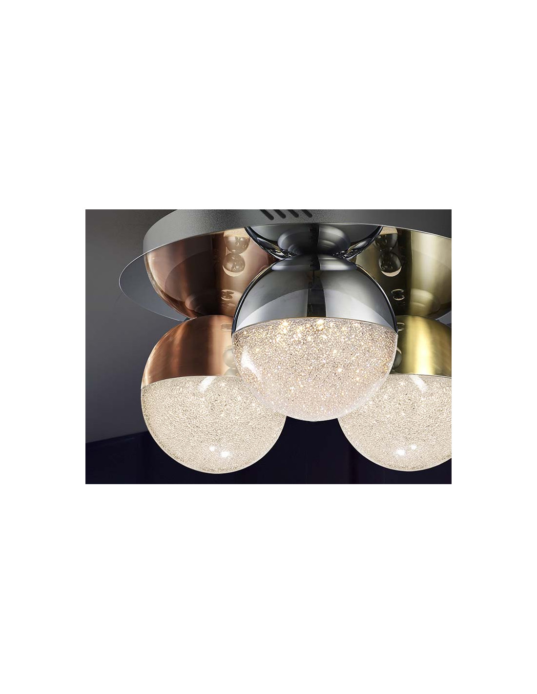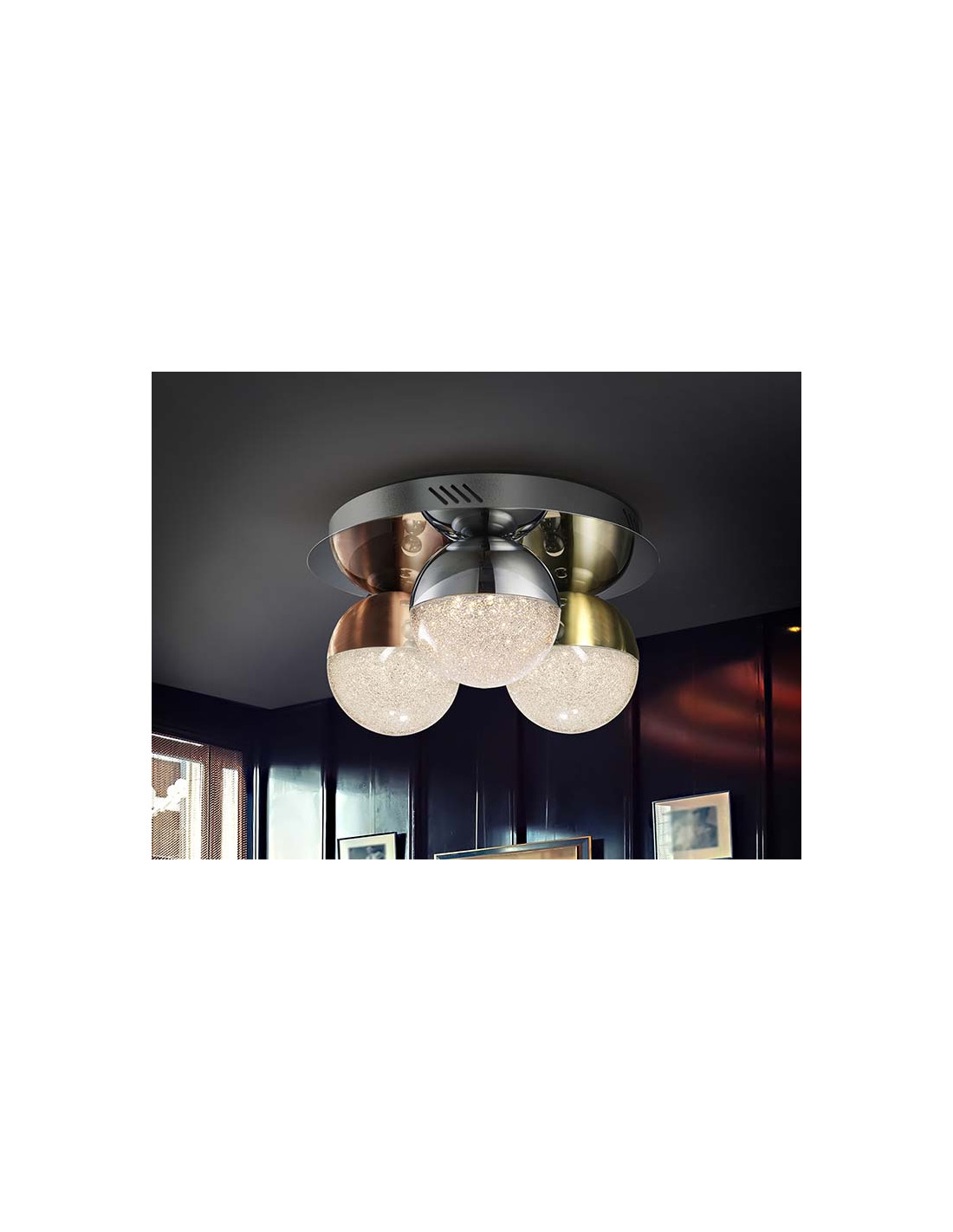 Plafón de techo de 3 luces LED, realizado en metal acabado cromo. Tulipas esféricas de 12 cm de policarbonato con interior texturizado y metal acabado en cobre satinado, latón satinado y cromo. 14,4W LED, 3.000 K, 1.000 lm, DIMABLE. 14,4W
