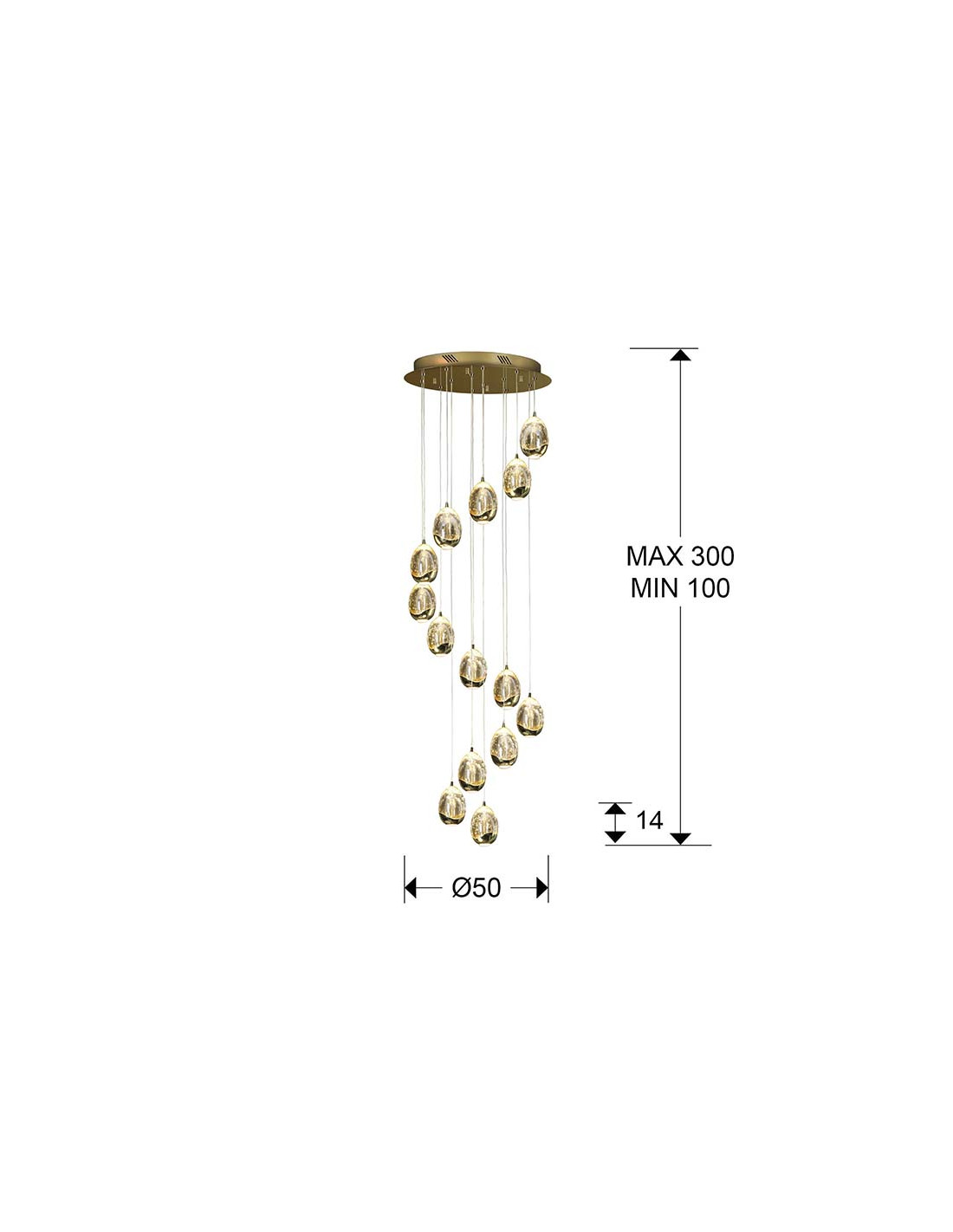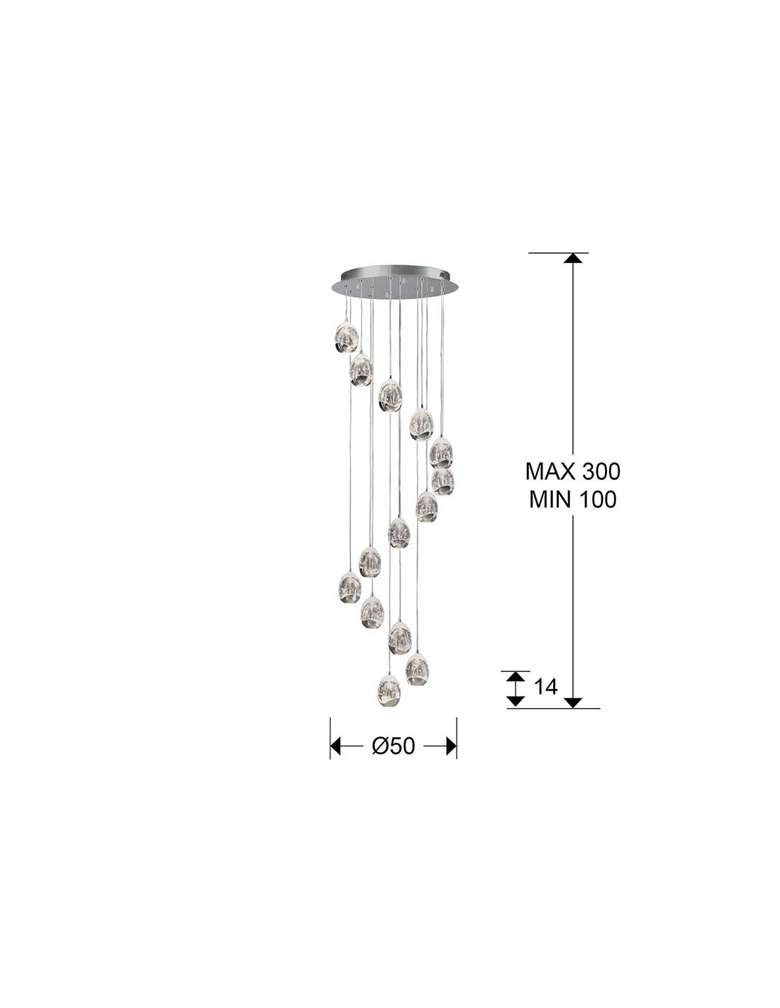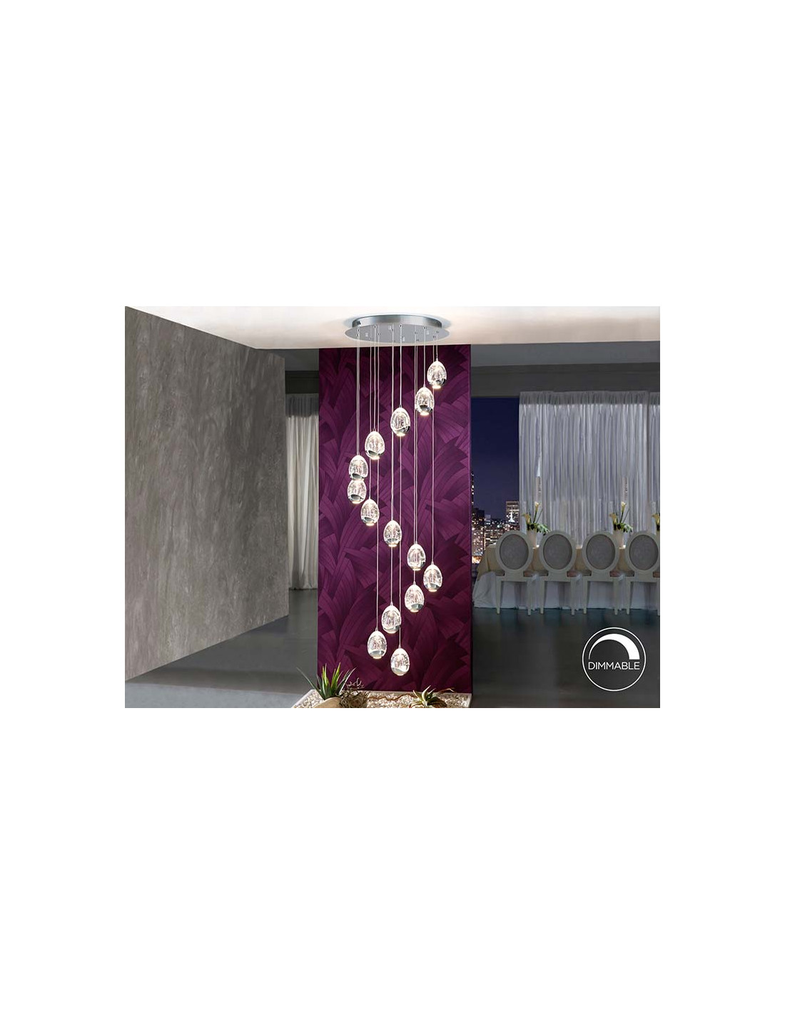 Lámpara de 14 luces LED. Realizada en metal. Tulipas con forma de gota realizadas en cristal macizo con burbujas decorativas en su interior. Regulables en altura. DIMABLE por BLUETOOTH con APP para smartphone.70W LED, 6.720 lm, 3.000 K. 70W