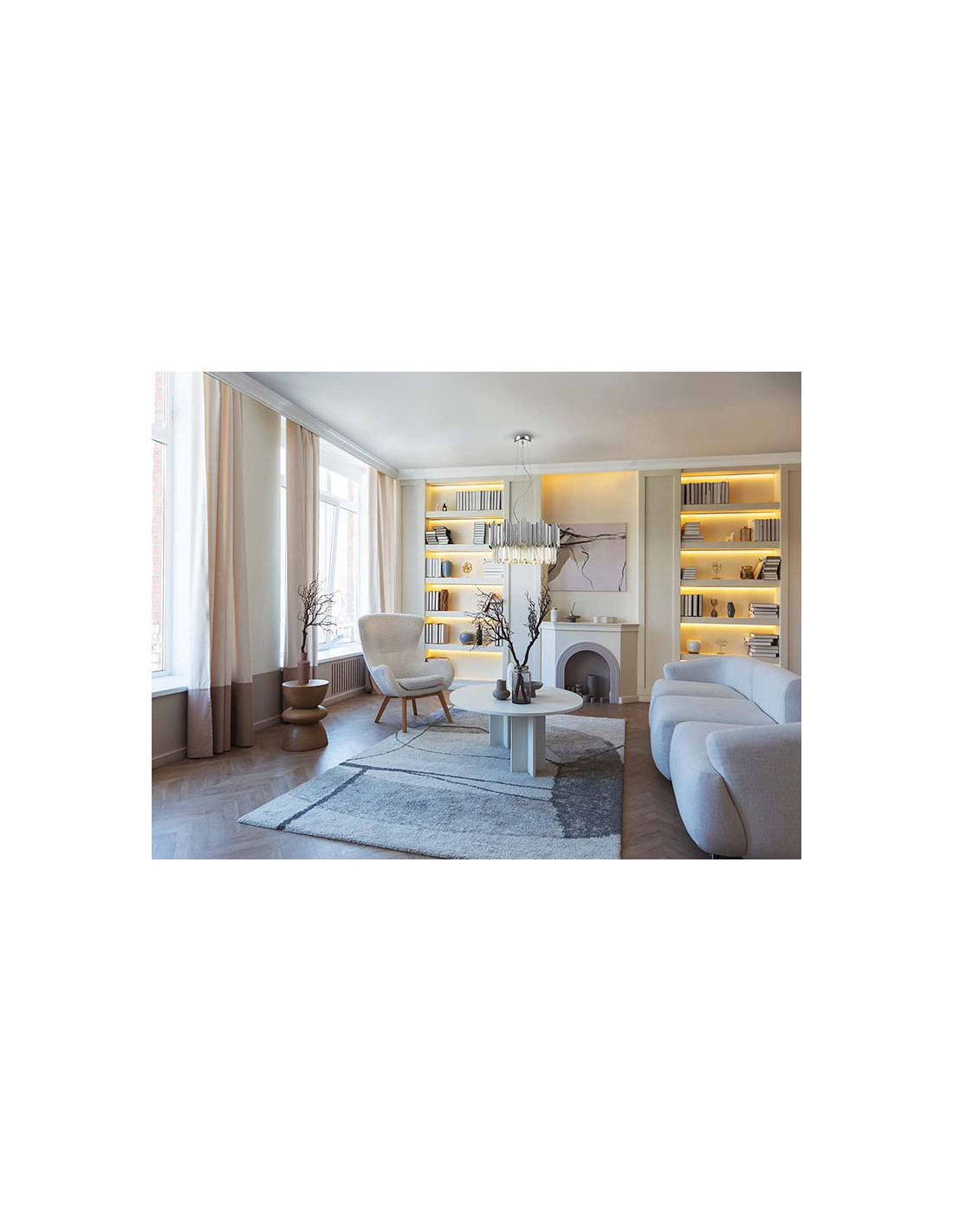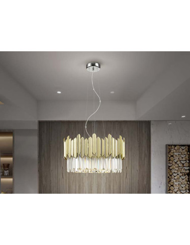 Lámpara realizada en metal. Pantalla de prismas de cristal facetado con remate de piezas de abs cromado. 6x28W