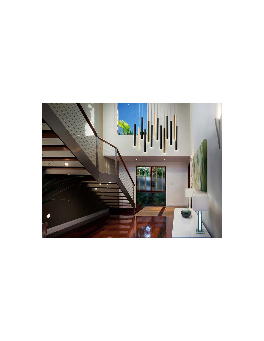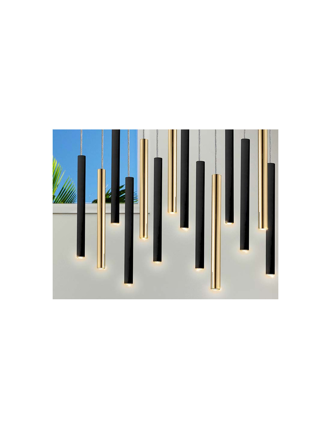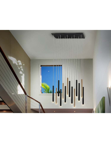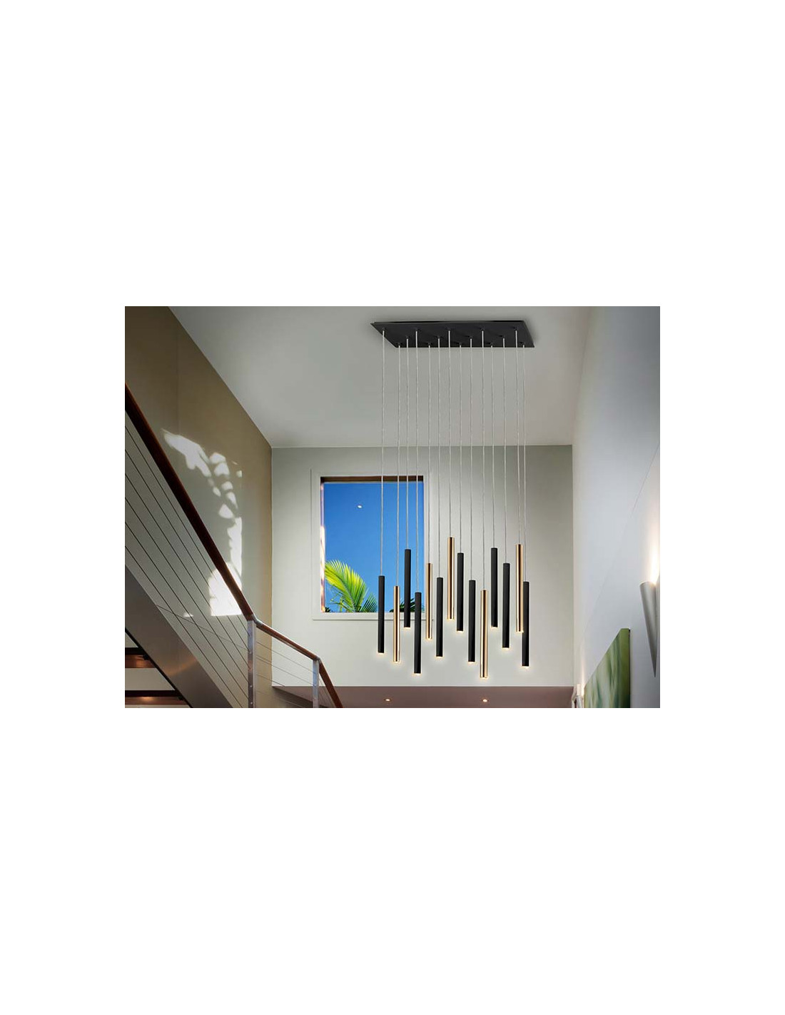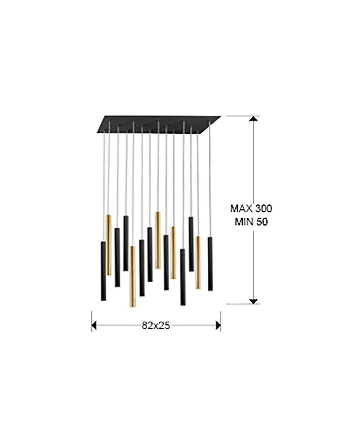 Lámpara de 14 luces LED. Realizada en metal. Difusor acrílico opal. 70W LED, 6,300 lm, 3.000 K. Altura máxima 300cm. DIMABLE. 70W
