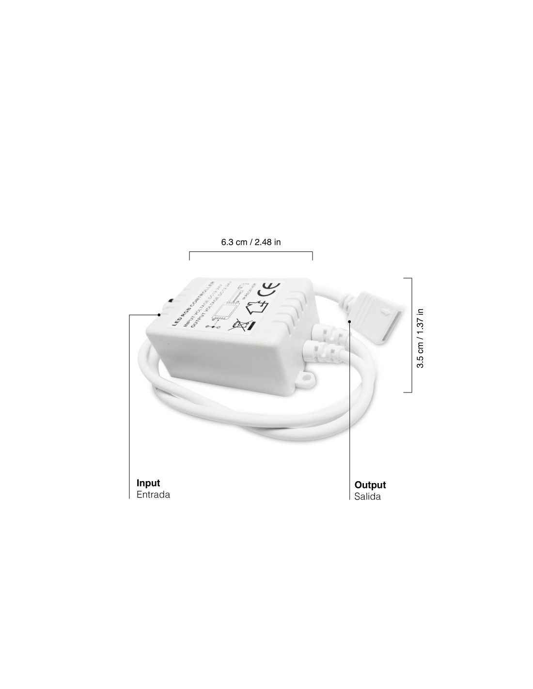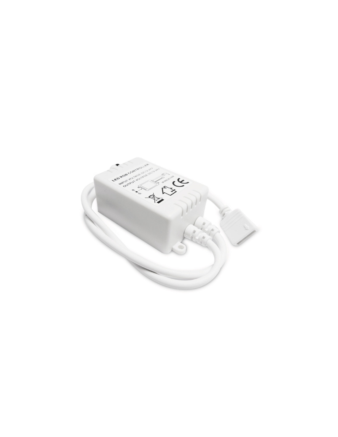 Este controlador RGB funciona con un voltaje de 12-24Vdc y debe estar conectado a una fuente de alimentación DC con el mismo voltaje, soporta entre 72W (12V) y 144W (24V) de consumo de energía (potencia | vatios) y una capacidad de <2A de corriente por canal (6A en total). Si necesita más capacidad de carga, se necesitará un amplificador, también conocido como "repetidor de señal".