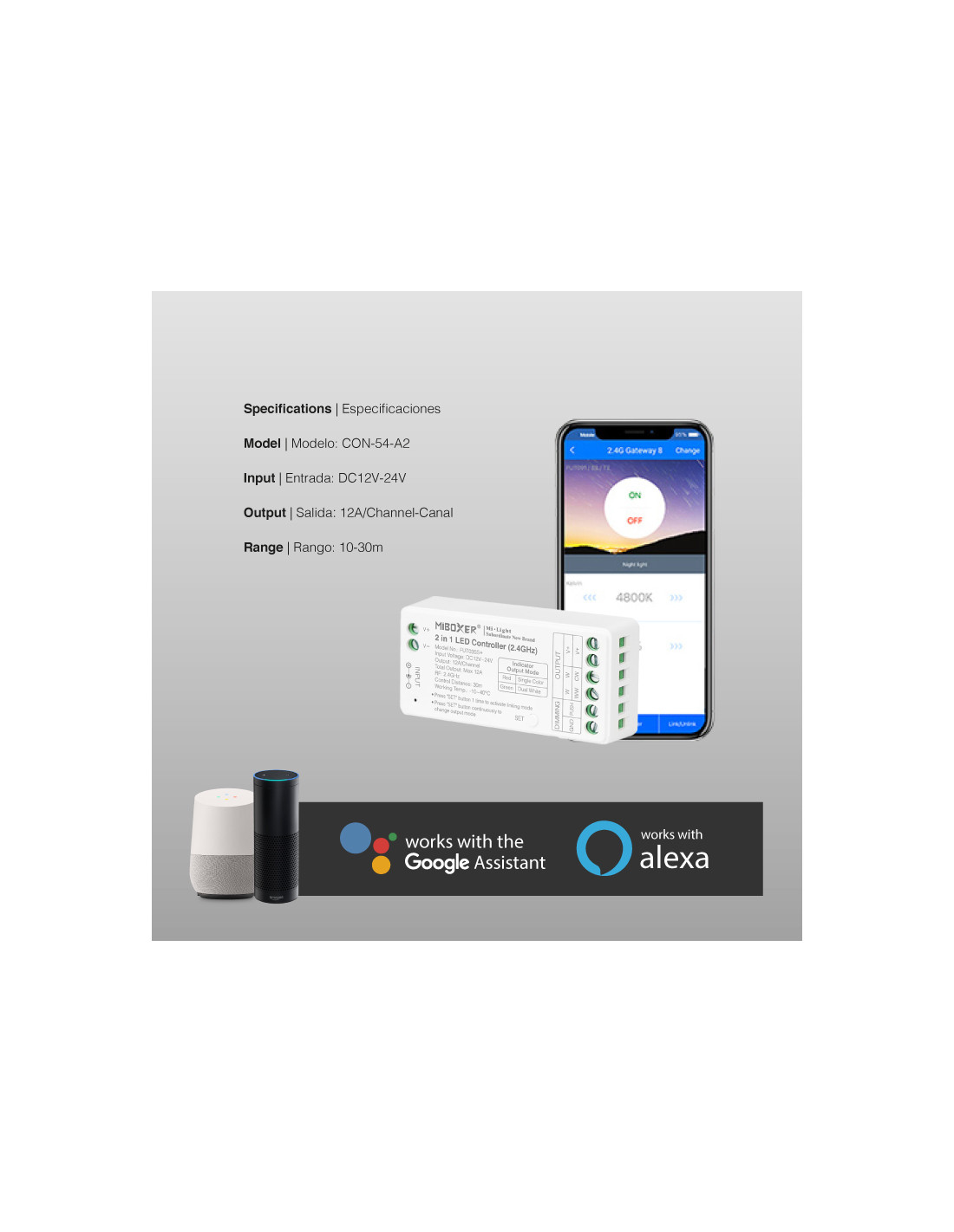 Este controlador maestro inalámbrico se utiliza para conectar las luces inteligentes a su dispositivo móvil. Este controlador se puede usar para controlar luces blancas y puede controlar tantas bombillas como sea posible. Funciona para teléfonos y tabletas Android, iPhone, iPad y iPod Touch. Puede unirse a redes domésticas o comerciales. El controlador maestro Wi-fi, que se puede utilizar para todas las series de luces inteligentes 2.4GHz, para controlar el brillo y la temperatura de bombilla de luz de color unico o dual. Con este simple controlador maestro Wi-fi, puede controlar sus luces con una versión de iOS 5.0+ o la aplicación de teléfono inteligente Android, descarga gratuita desde Apple App Store o Android Google Play con el nuevo nombre de la aplicación: Mi-light, con configuración automática. (Compatible con las series Mi-Light, Dual White LED Light y controlador de tiras LED 2.4G). Configuración del controlador de Wi-fi: Suministre energía a la caja del controlador Wi-Fi con una fuente de alimentación 12-24V 12A, el indicador de energía parpadeará. Mantenga presionada la tecla “RST” durante 10 segundos hasta que los dos indicadores parpadeen, vuelva a la configuración predeterminada de fábrica. (Tenga en cuenta que no es necesario que lo haga con un nuevo controlador de Wi-Fi). Vaya a la configuración de su teléfono inteligente o tableta Android o Apple iOS y conéctese con “MI light”. El indicador de enlace de la caja del controlador Wi-Fi se ilumina cuando se realiza la conexión. Presione "Mi-light". Opcionalmente, puede cambiar el nombre de "MI light" a cualquier nombre, p. Ej. La habitación de Peter (en caso de que agregue más cajas de Wi-Fi para más zonas). Presione "Mi-Light" de nuevo para finalizar la integración automática con su WLAN doméstico
