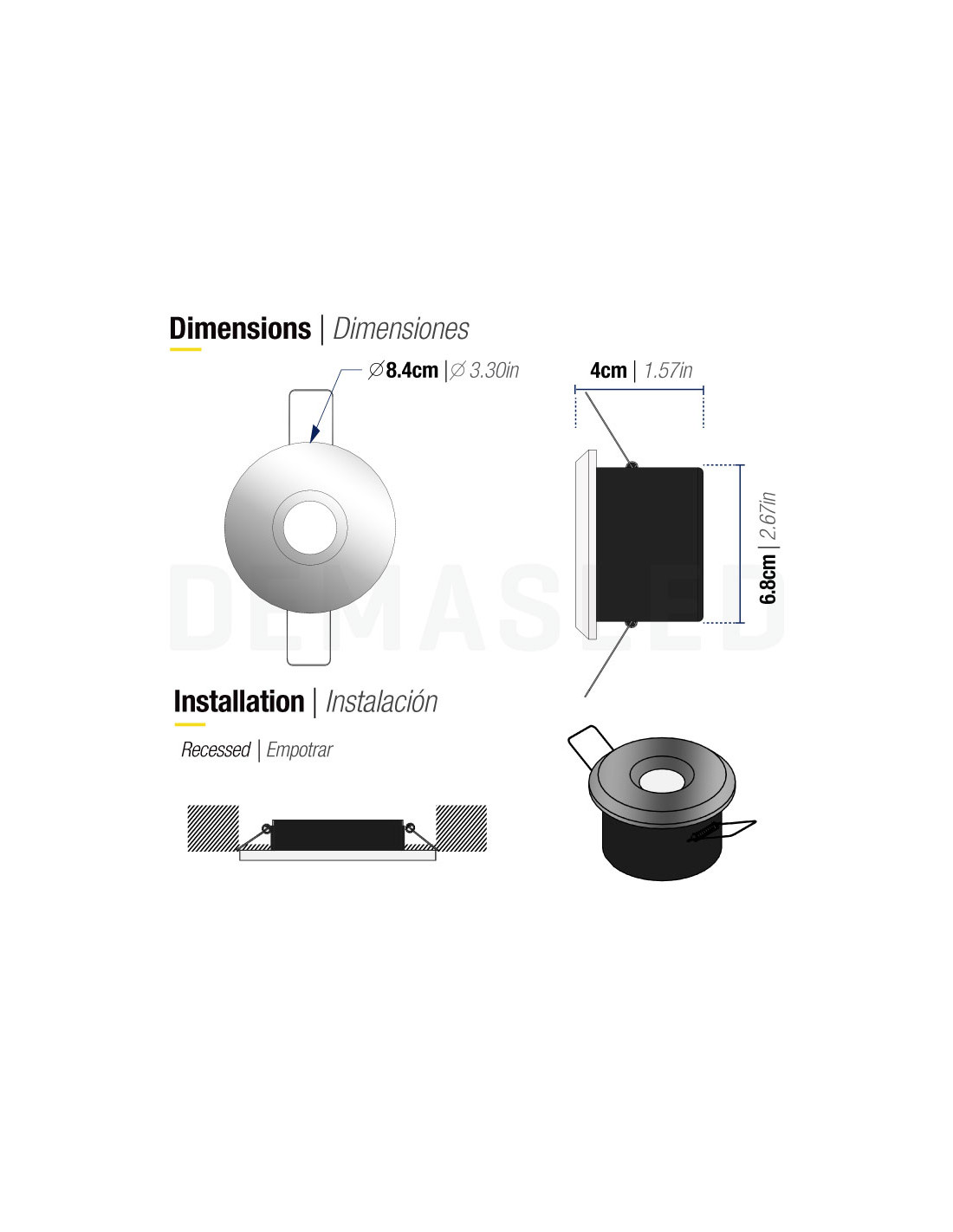 Su diseño compacto y su fácil instalación mediante soportes ajustables y clips de resorte hacen que este spot sea una opción práctica para cualquier entorno, asegurando una fijación segura y una instalación sin complicaciones. Con un diámetro total de 8,4 cm y un tamaño de corte de 6,8 cm, es perfecto para una variedad de aplicaciones, tanto residenciales como comerciales.