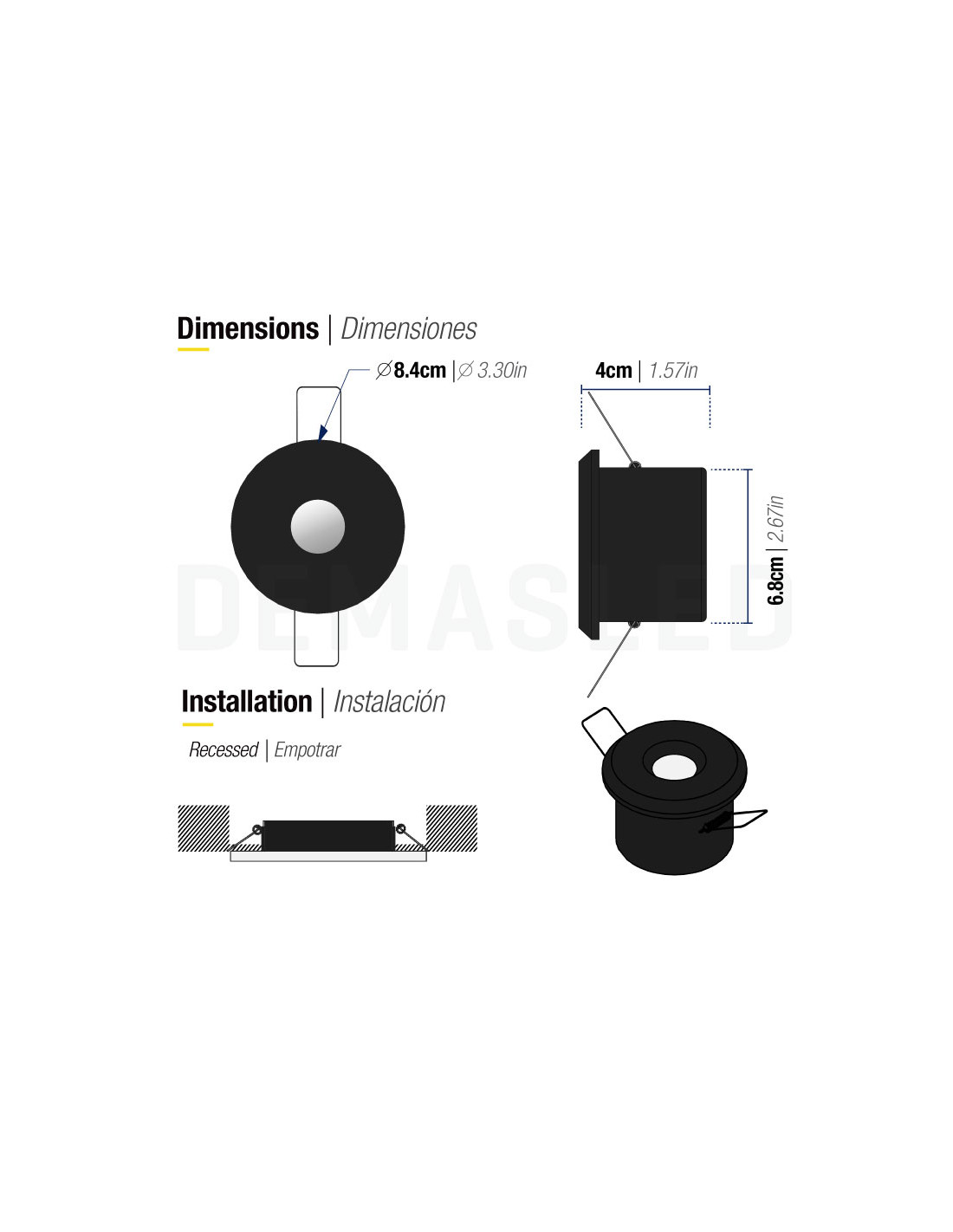Su diseño compacto y su fácil instalación mediante soportes ajustables y clips de resorte hacen que este spot sea una opción práctica para cualquier entorno, asegurando una fijación segura y una instalación sin complicaciones. Con un diámetro total de 8,4 cm y un tamaño de corte de 6,8 cm, es perfecto para una variedad de aplicaciones, tanto residenciales como comerciales.