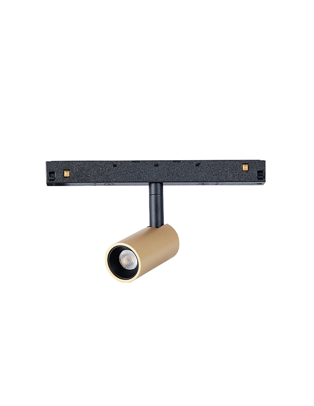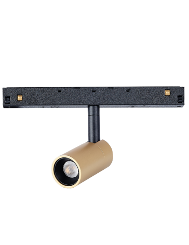 Foco para carril magnético de la familia MAGNETO fabricado en Aluminio, cobre y plásticos. Con LED integrado de 5W de potencia que ofrecen 400lm. en 3000K Blanco Cálido. Etiqueta Energética F.
