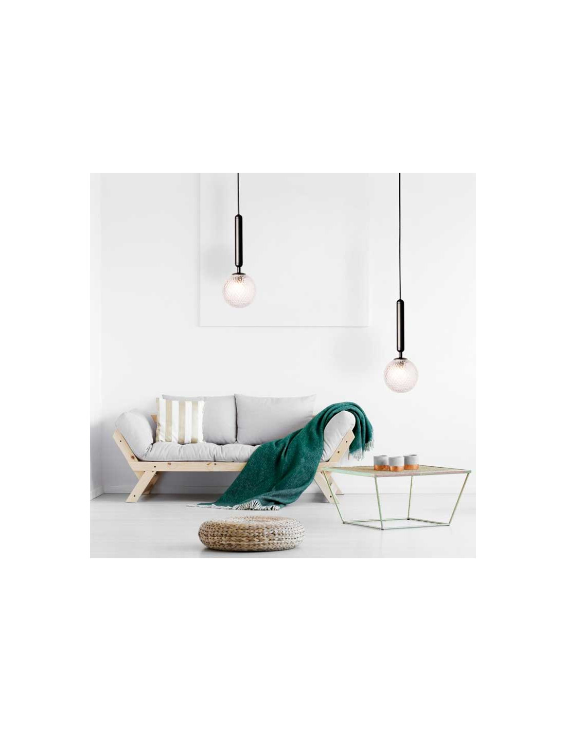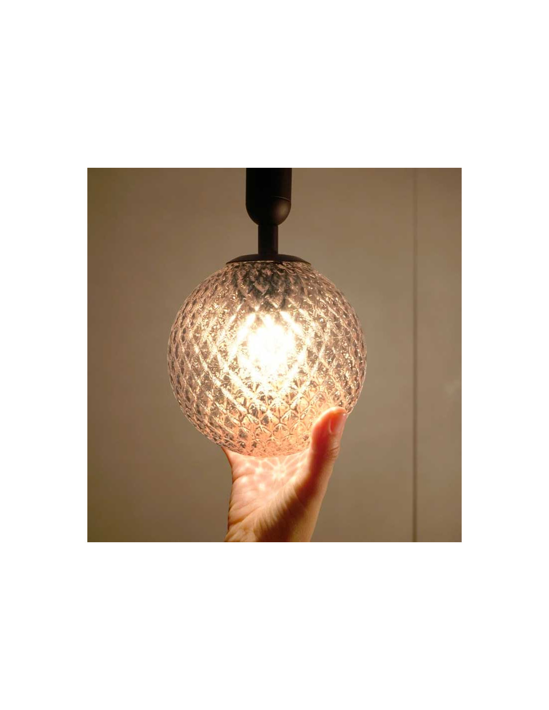 Lámpara de techo de metal en acabado negro mate, con una bola de vidrio texturizado transparente texturizado. La luz proyectada crea un ambiente especial gracias a la textura del cristal, dando como resultado un efecto sorprendente. El cable está recubierto con tela de nylon negro. Funciona con bombilla G9.