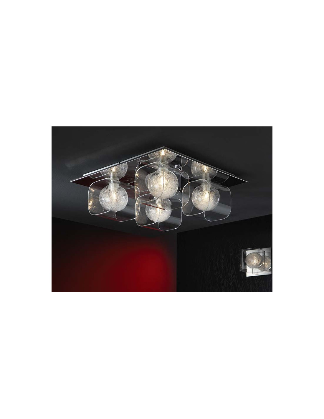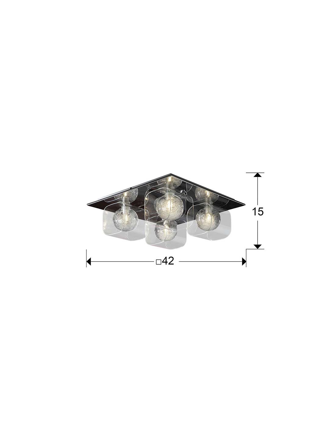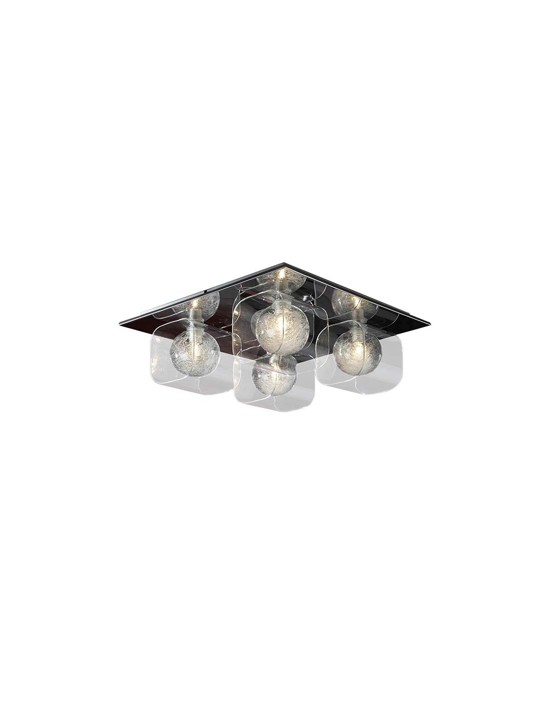 Plafón de 4 luces realizado en metal, acabado cromo brillo.Tulipas de cristal moldeado, bola interior decorada con filamentos de cristal. 4x42W