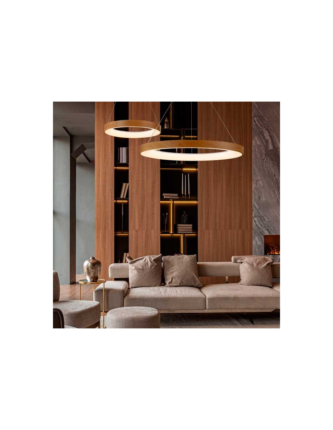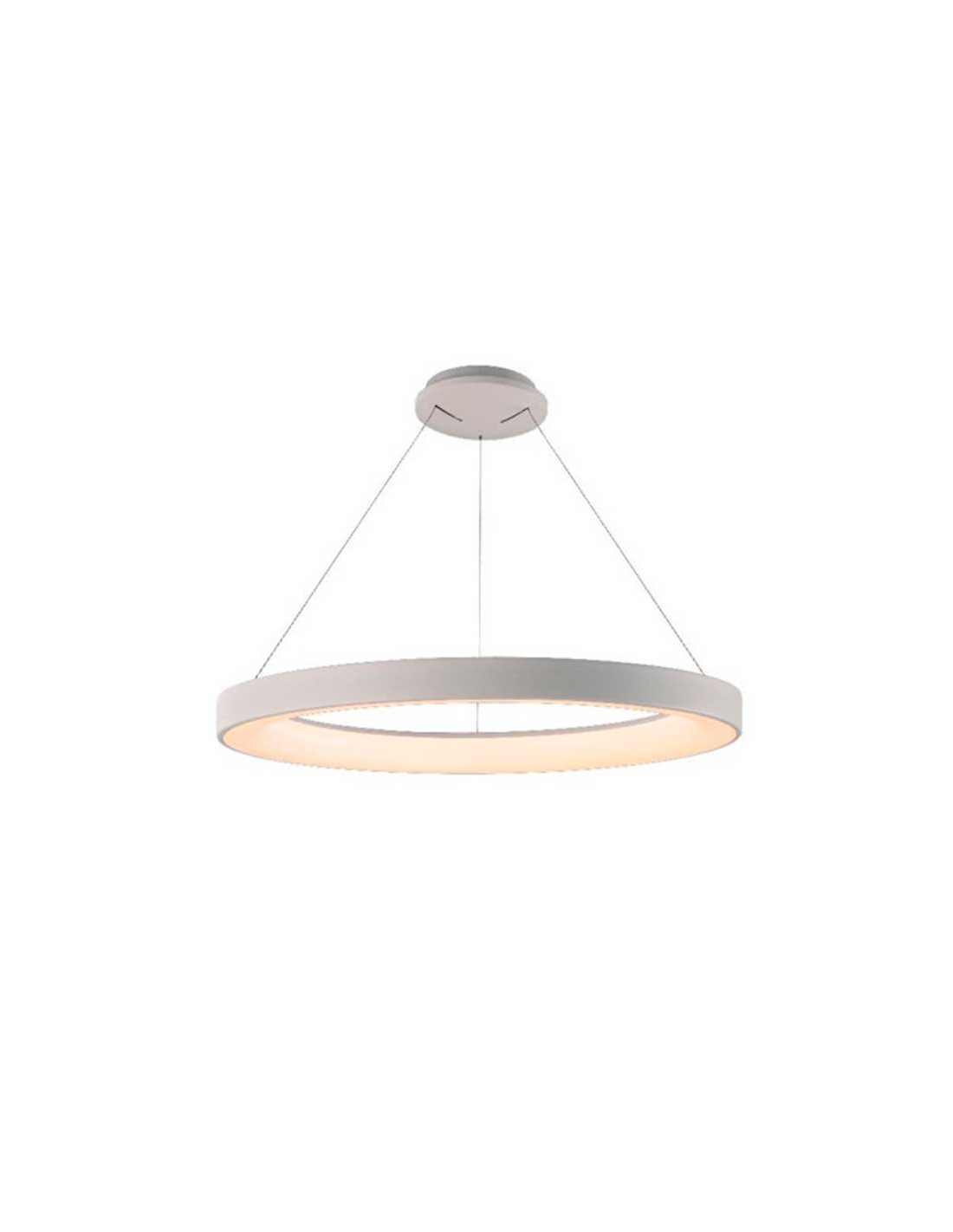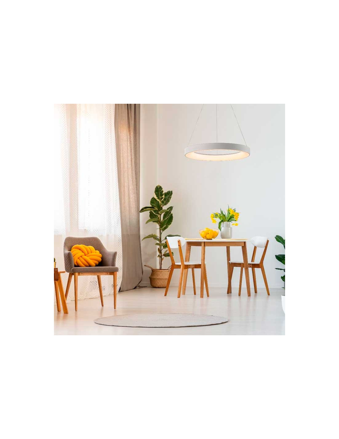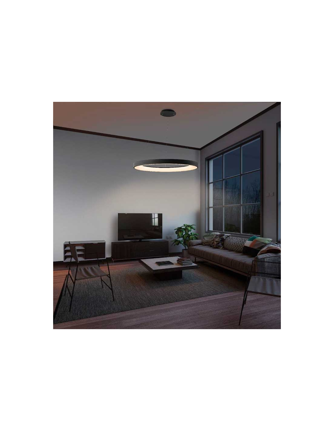Lámpara de techo colgante en metal y acrílico. Con LED integrado de 50W y 3760lm. Dimable y con selección de temperatura de color entre 2700K, 4000K y 5000K. Dispone de mando a distancia y app gratuita para cambiar y regular tono de luz e intensidad.