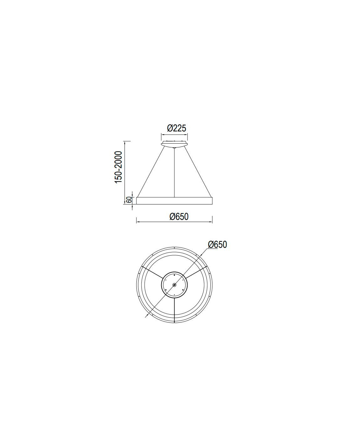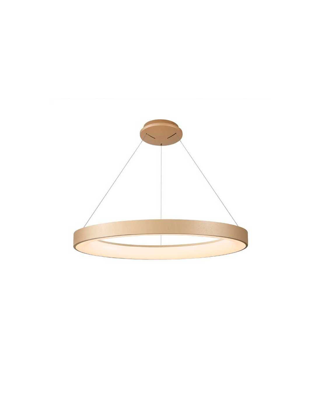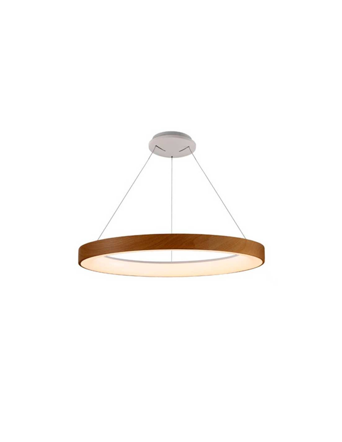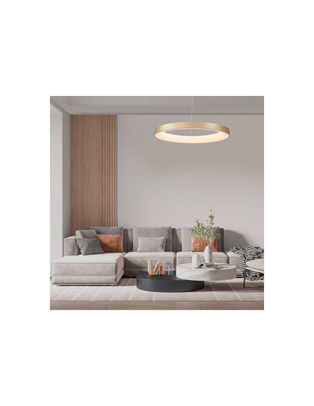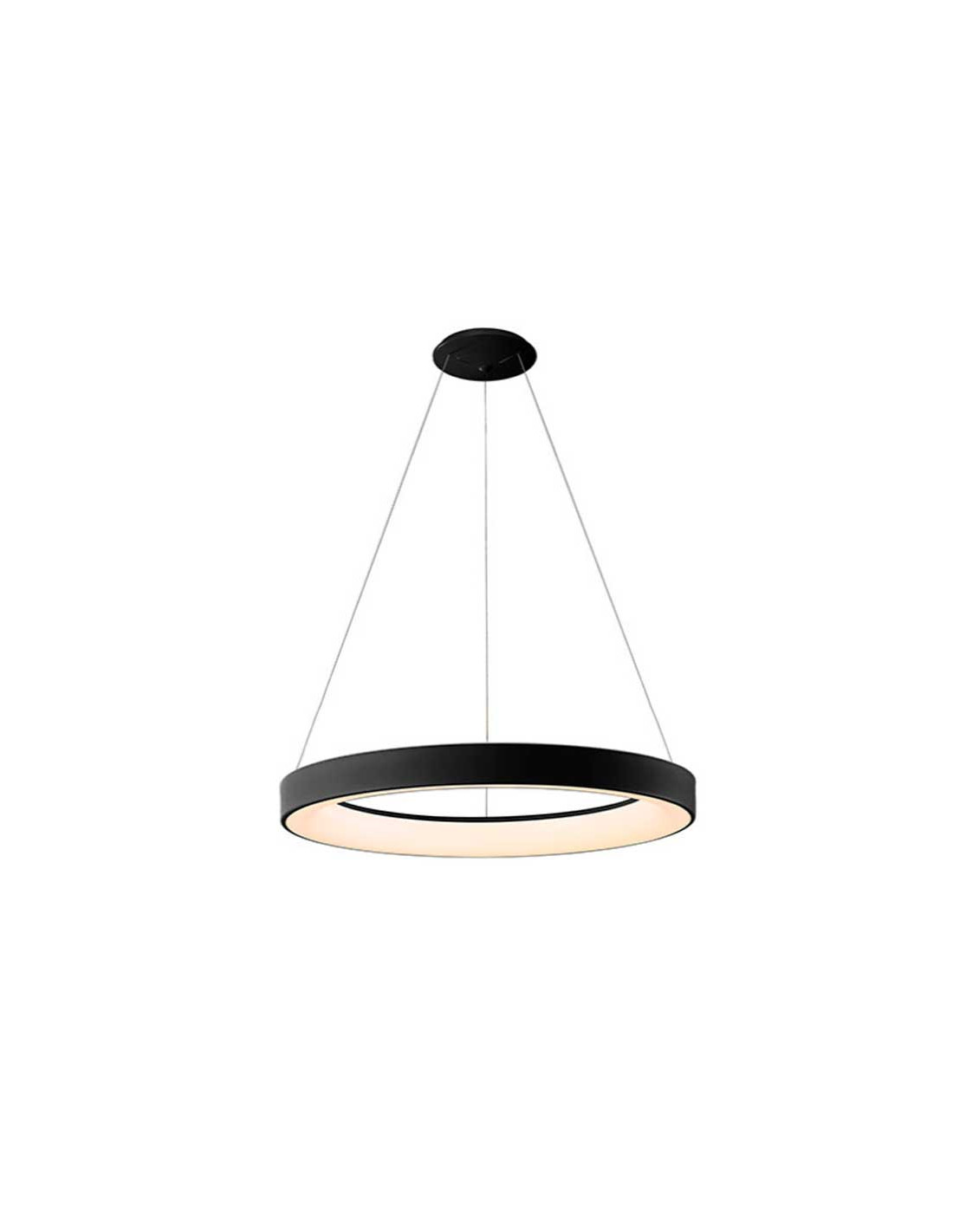 Lámpara de techo colgante en metal y acrílico. Con LED integrado de 50W y 3760lm. Dimable y con selección de temperatura de color entre 2700K, 4000K y 5000K. Dispone de mando a distancia y app gratuita para cambiar y regular tono de luz e intensidad.