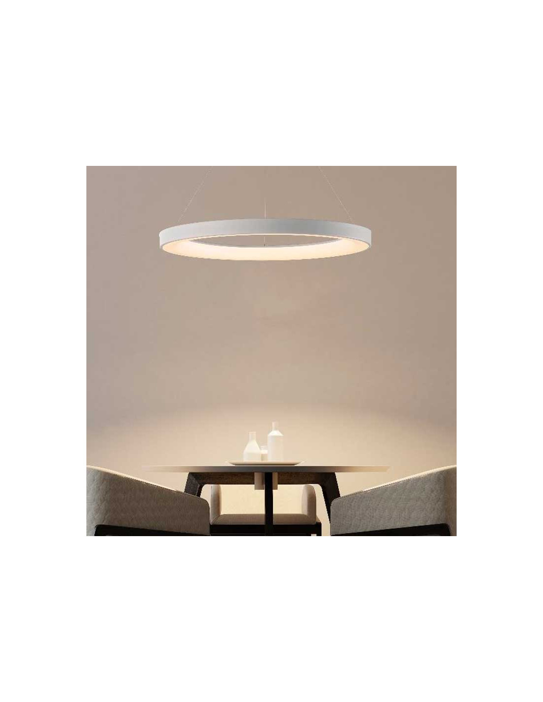 Lámpara de techo colgante en metal y acrílico. Con LED integrado de 66W y 5440lm. Dimable y con selección de temperatura de color entre 2700K, 4000K y 5000K. Dispone de mando a distancia y app gratuita para cambiar y regular tono de luz e intensidad.