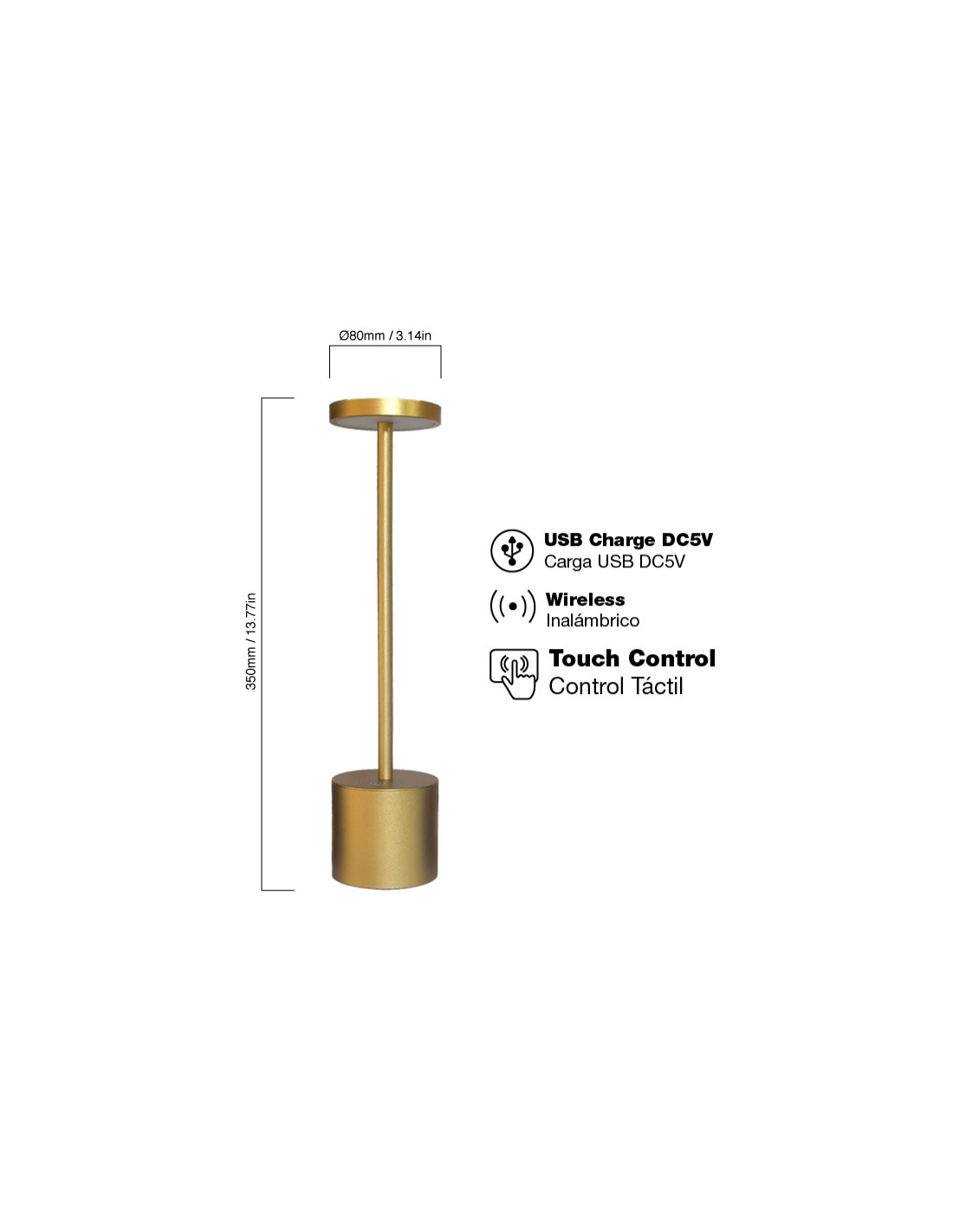 Fabricada en aluminio cromado con un acabado dorado, esta lámpara destaca por su estética contemporánea y dimensiones optimizadas (diámetro de 80 mm y altura de 350 mm). Perfecta para decorar salas de estar, habitaciones o espacios comerciales.