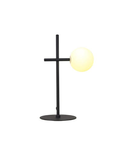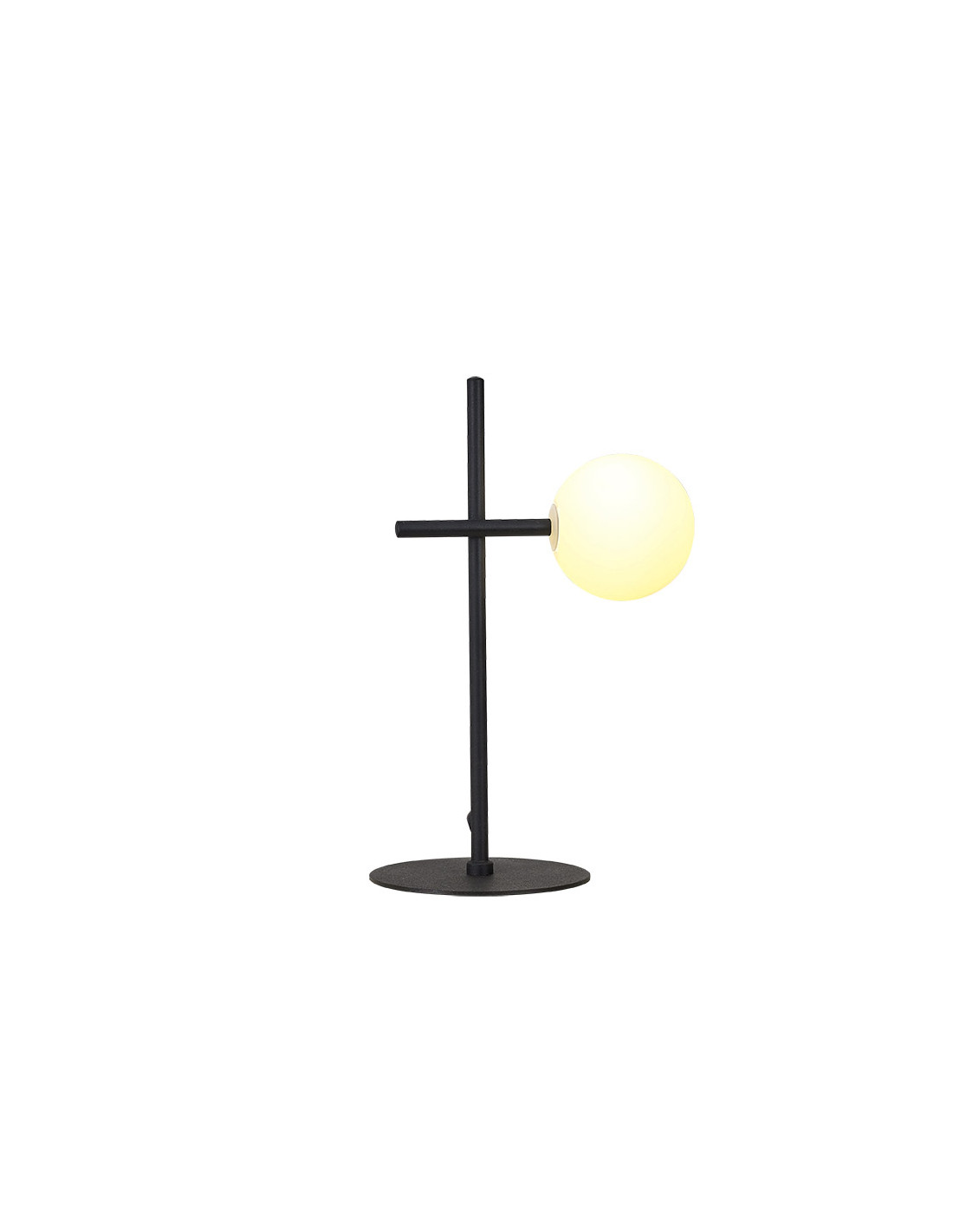 Lámpara de sobremesa de la familia CELLAR fabricado en Hierro y cristal con acabado en Negro. Con pantalla Cristal Blanco. Para 1 bombilla G4 de 5W de potencia (bombilla incluidas).