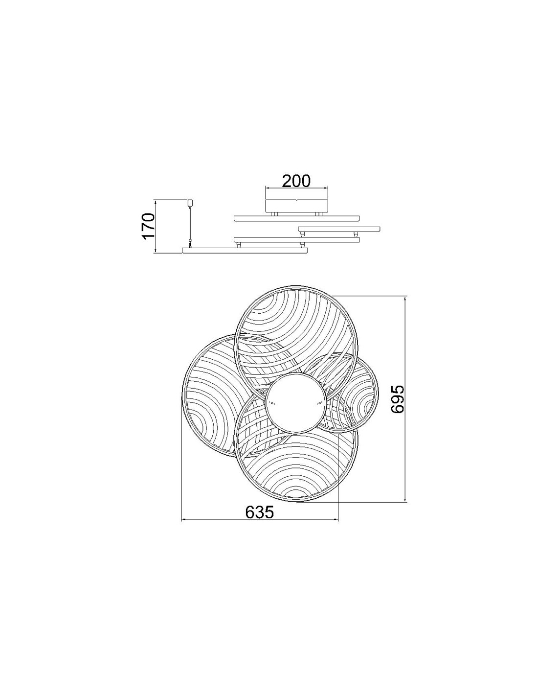 Plafón de techo de la familia COLLAGE fabricado en Aluminio y hierro. Con LED integrado de 60W de potencia que ofrecen 4500lm. en 3000K Blanco Cálido. Etiqueta Energética G.