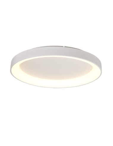 Plafón de techo de la familia NISEKO II fabricado en Acero y Acrílico. Con pantalla Acrílico Blanco. Con LED integrado de 62W de potencia que ofrecen 4700lm. en 2700K-5000K. Dimable. Incluye mando a distancia. Etiqueta Energética E.