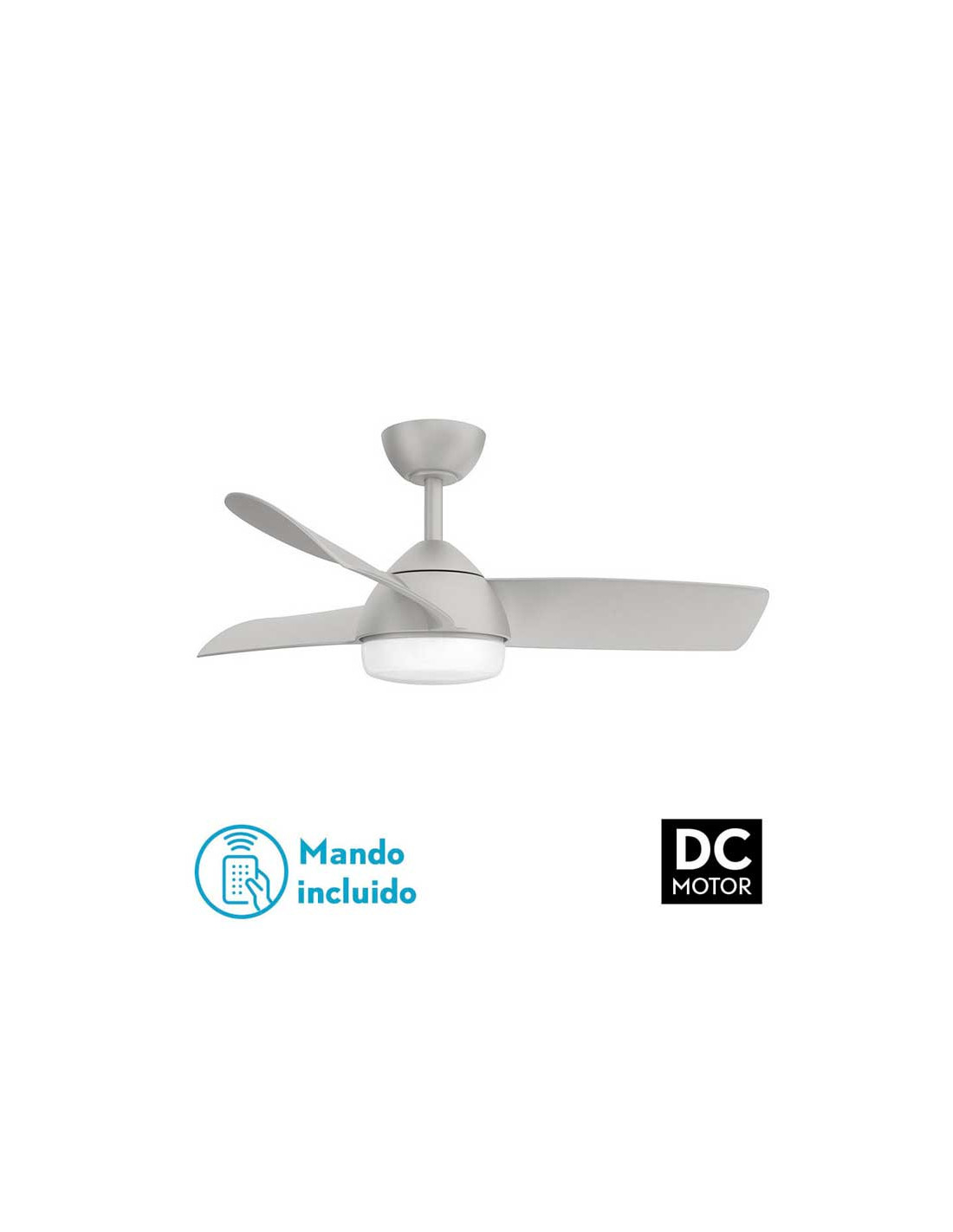 Ventilador realizado en metal con TRES aspas. Cuenta con motor DC con tres velocidades ajustables. Tecnología LED incorporada con una potencia de 24W, con 3 TEMPERATURAS DE LUZ (3000-4000-6000K). Su medida es de 50X107X107 centímetros. Control de aire verano o invierno. Mando a distancia INCLUIDO con MEMORIA DE COLOR incorporada y TEMPORIZADOR 1/2/4/8 H.